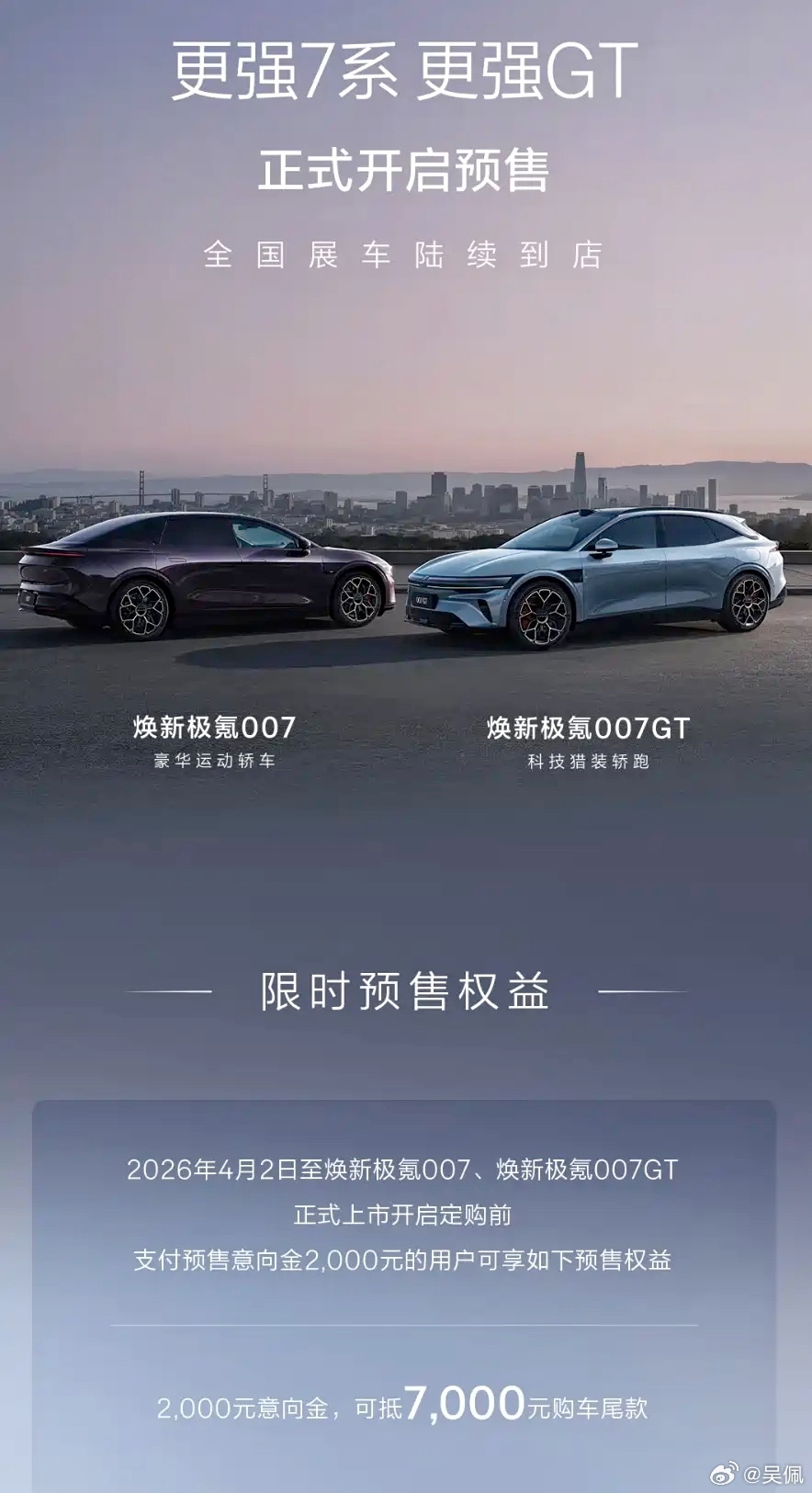 颜控的车迷朋友可以留意一波了,焕新极氪007、焕新极氪007GT 预售开启,有2000元抵7000元的预售权益。新车其实升级了不少东西,900V高压架构有了,激光雷达保留并升级成了700TOPS算力的Thor-U芯片,Eva机器人和ZEEKR AI OS7座舱则是首发,4月10号会正式上市。