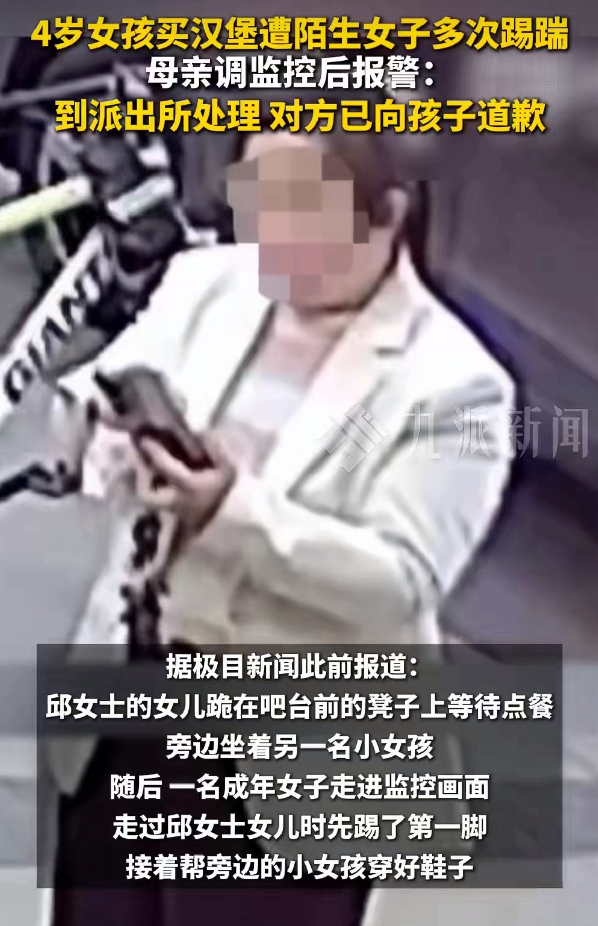 🔻打了马赛克,我都能认出来,是什么脸型。4岁女孩独自买汉堡遭陌生女子踢踹