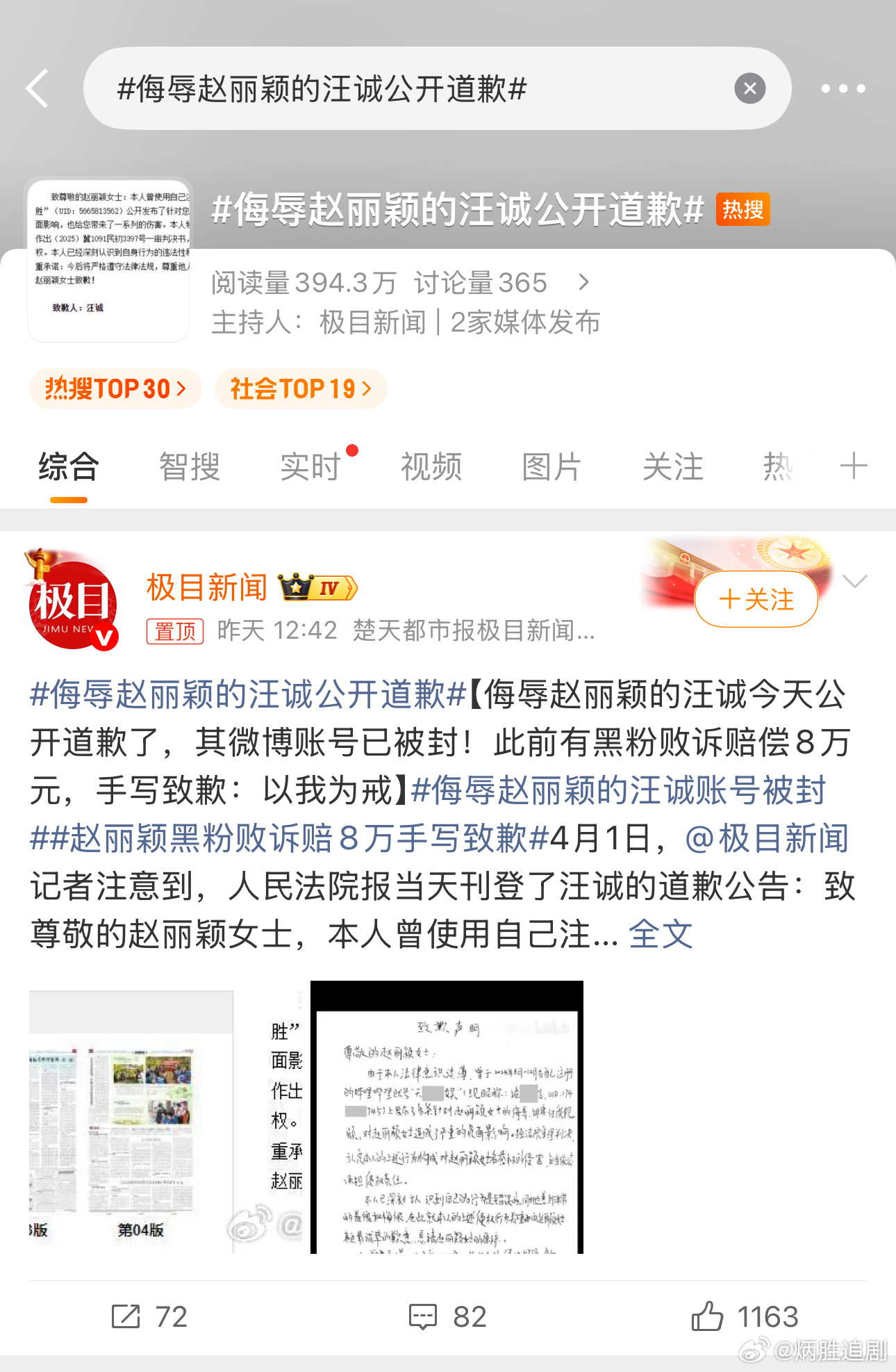 今天就有媒体直接曝光素人全名+主榜热搜,素人毫无抵抗能力,这个真的…..又是这个极目新闻… 侮辱赵丽颖的汪诚公开道歉