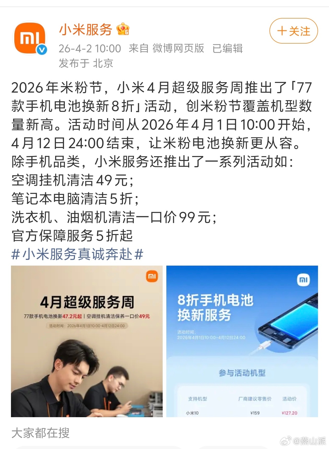 小米4月超级周具体有些啥福利:活动从4月1日一直持续到12日,时间够久;支持77款手机换电池,而且全部8折,最低只要42.5块,其中小米10、K40系列都在其中;除了换电池,还有49元空调挂机清洁保养,马上夏天了这个我强烈推荐;笔记本5折清洁;洗衣机、抽油烟机99元清洁。