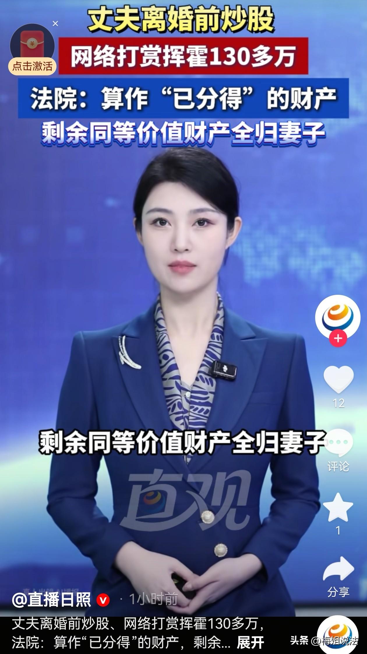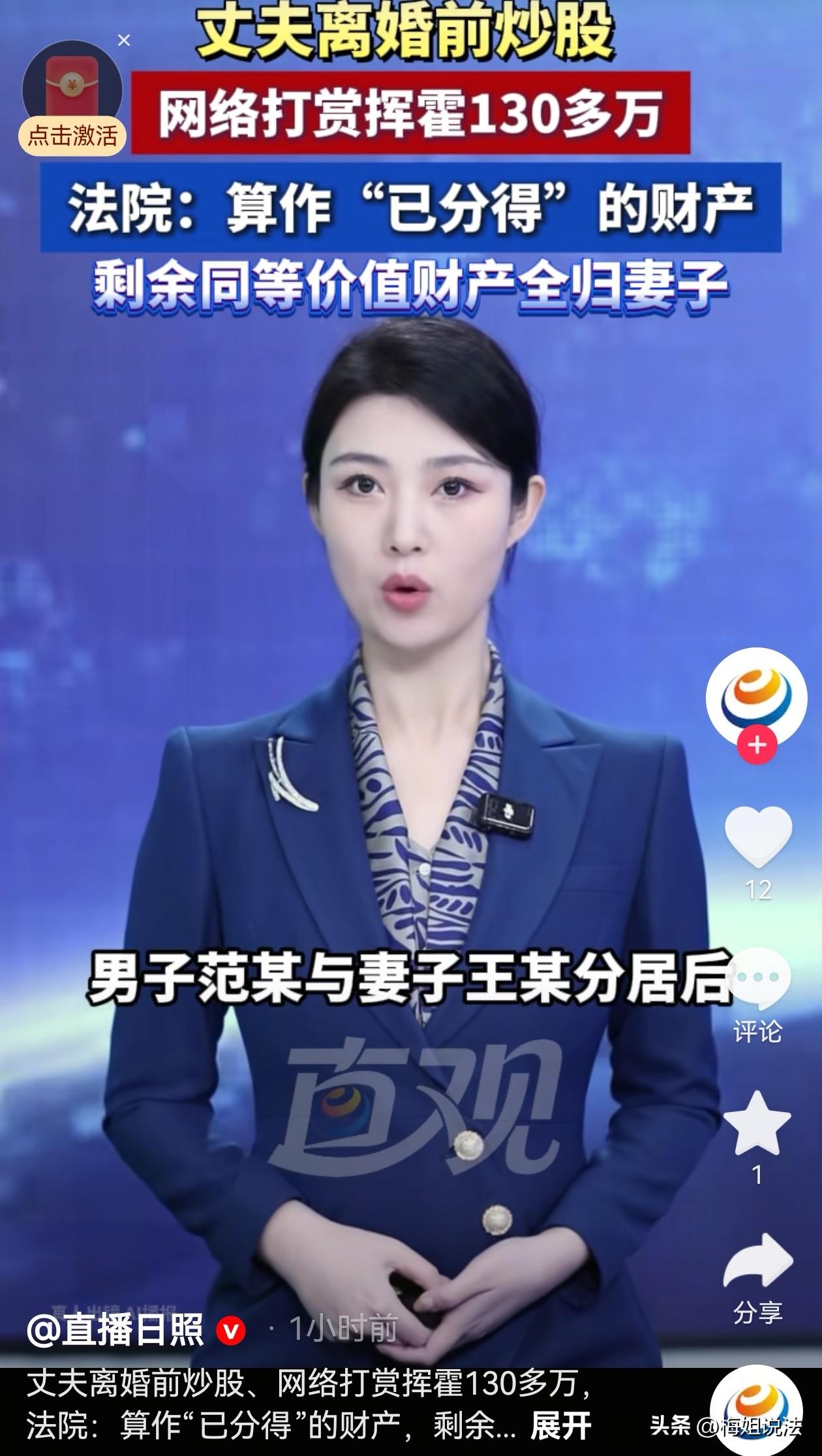 北京,一男子背着妻子,长期联系女直播打赏等,将家里的130万元挥霍一空,离婚时,妻子主张分割夫妻共同财产,丈夫不同意,说那是他自己的钱,自己可以决定怎么花,妻子把丈夫告了,判决结果大快人心! 2018年3月,王女士与丈夫结婚,结婚后他们感情也挺好,生活虽然没有什么轰轰烈烈,平平淡淡的,她觉得也挺好。 他们一起熬过了7年之痒,日子也越来越好。家里存款也渐渐多了起来。 一切都在朝好的方向发展,他们甚至用多余的钱买了房子投资,王女士心里挺知足。 可是,家里有钱了,老公却不消停了。 她老公渐渐开始喜欢上了玩股票,开始的时候,投的钱也不多,有亏有赚。王女士说老公其实不太懂这些,希望他早点收手,不然早晚得陷进去。 老公哪里听得进去,他觉得自己好好钻研,说不定哪一天就能赚到大钱。 还别说,在一次偶然的机会,他小赚一笔,王女士起初也挺开心。想着那就随他去吧,反正又管不住,说了也不听。别让他投入太多就行。 接下来的一段时间可能是丈夫的运气比较好,他又赚了一点。赚到了钱丈夫可嚣张了,开始在网上看一些美女主播,王女士看着他就生气。 一把年纪了还看美女,王女士总是唠叨。丈夫却告诉她男人都喜欢看。那些不看的也都是装的,自己是诚实,才不偷偷看。 丈夫还说:如果大家都不看,那些人怎么可能火起来,他们火,难不成是你们女人给捧出来的? 对于丈夫的歪理,她懒得再说什么,但后来,她发现丈夫居然还给美女大把大把的打赏,甚至找他们聊天,聊的内容让她接受不了。 王女士说你在这样下去,日子还能过吗?要不我们冷静一下吧,分开住一段时间,如果你还能回到从前那样,咱俩就继续过,如果分开这一段,你更自在,我们就离了吧。 王女士原本以为丈夫会立马下定决心痛改前非,没想到他都没认真听自己讲的话,一直沉迷于网络的世界。 就这样,在2022年10月,他们暂时分居了。 分居期间,妻子王女士拿走了家里的存款,丈夫手里没多少钱,他炒股当然也不能一直那么顺,赔了不少钱。 但他并没有收敛,而是更放肆了,他把家里的一套房卖了差不多90万,自己工作也提前退了,获得了赔偿金20万,他还把公积金取出来了,差不多30万 丈夫每天依旧沉迷于股票和看美女。不知不觉4年间,股票赔了80多万,打赏花了50多万。 这些妻子王女士都不知道,丈夫手里的钱挥霍的差不多了,她又惦记上了家里的存款。 如果自己跟妻子要钱,妻子不可能把钱拿出来,他想反正都分居好几年了,这和离婚也没什么区别,反正俩人谁也不能迁就谁。莫不如离了算了,自己还能再从妻子那里分得一部分财产。 于是2024年丈夫以夫妻感情破裂为由,提起诉讼离婚。王女士这些年自己一个人过得也挺好,就毫不犹豫的答应了。 当他们要分割家里财产时,王女士本以为加上房产,自己还能在分得一部分。没想到丈夫还想分她手里的存款。 经过了解后,她才知道丈夫把房子都卖了,钱也花没了,这时他才知道丈夫这几年,班也不上了,还挥霍了了130多万。 王女士认为丈夫花的是他们夫妻共同财产,不经她的同意就花了她的那一部分,处于侵犯了自己的合法权益,要求丈夫把钱还给自己。 经审理认为,王女士丈夫的买房款、离职补偿款、公积金都属于夫妻共同财产,未经王女士同意,丈夫用于炒股和打赏,明显超出日常开销,属于挥霍夫妻共同财产,侵害了王女士的合法权益。 最后判决,丈夫挥霍的财产是属于夫妻共有,当做他已经分得的财产。剩余的等价值财产,也属于夫妻共有,判给王女士。 《民法典》第1062条:夫妻在婚姻关系存续期间所得的下列财产,为夫妻的共同财产,归夫妻共同所有: (一)工资、奖金、劳务报酬; (二)生产、经营、投资的收益; (三)知识产权的收益; (四)继承或者受赠的财产,但是本法第一千零六十三条第三项规定的除外; (五)其他应当归共同所有的财产。 夫妻对共同财产,有平等的处理权。 王女士丈夫分居期间花得钱属于夫妻共同财产。也就是说丈夫花的钱里有王女士的一半财产。 《民法典》第1087条第1款:协议不成的,由人民法院根据财产的具体情况,按照照顾子女、女方和无过错方权益的原则判决。 就分割财产双方协商不一致的部分,即王女士丈夫花掉的那部分,是他个人行为,代表不了王女士的意愿,钱是他自己花的,花没了,是他自己的过错,也应该由他来承担责任,不能牵连王女士。 大家对此案怎么看,欢迎留言评论!