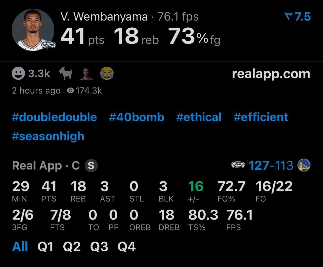 文班亚马29分钟砍下41分18篮板3助攻3盖帽0失误,22中16。