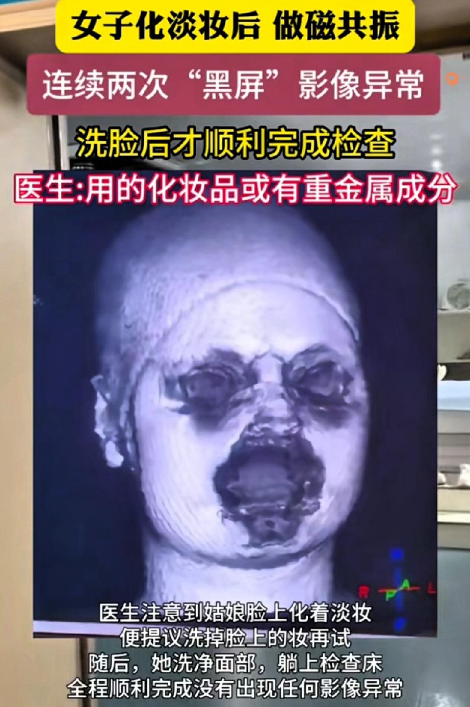 解释不清了! 做磁共振居然败在了一张脸上,这事真的太颠覆认知了。 福建一位29岁女生因为头晕去做头颅磁共振,两次都因为面部成像异常被迫中断,首饰、钥匙、金属饰品全摘了,没纹眉没整形,连医生都犯了难。 最后才发现,问题居然出在脸上的淡妆里。 很多人都不知道,粉底液、散粉里常见的氧化铁、金属氧化物,在磁共振强磁场下会形成伪影,直接挡住脑部影像。 我们平时只在意看得见的金属,却忽略了化妆品里藏着的“隐形干扰源”,这才是最容易踩坑的地方。 这件事也给所有人提了个醒,去医院做检查别只摘首饰,头面部检查前一定要彻底卸妆,不然真的会耽误诊断。 以后去做磁共振,你会记得提前把妆卸干净吗?