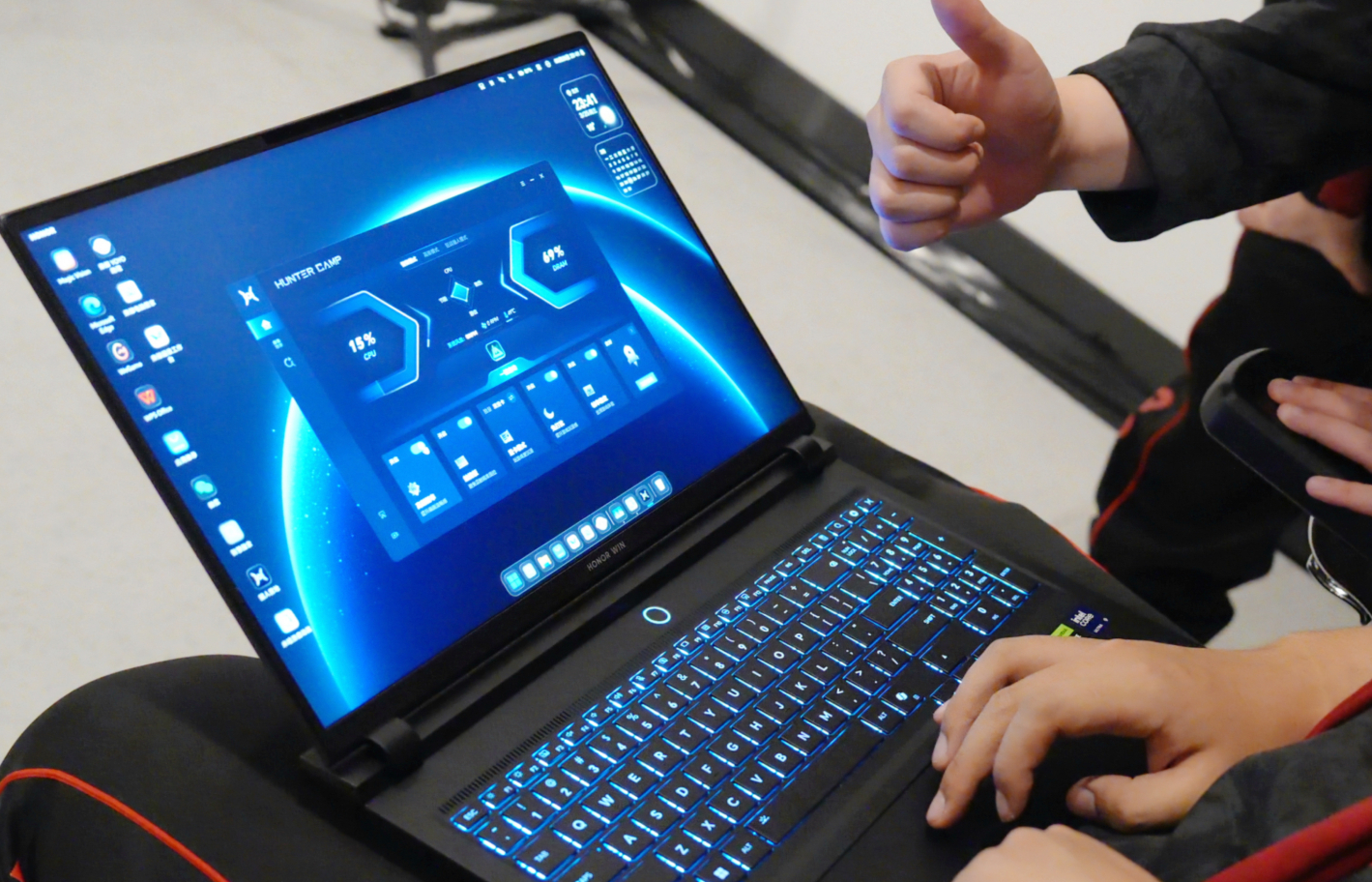 可以看到荣耀WIN游戏本真机了,细节挺多,发光的logo设计、Honor WIN标识、定制的主题桌面等等,定位是高端性能旗舰,这个月应该就能见到了