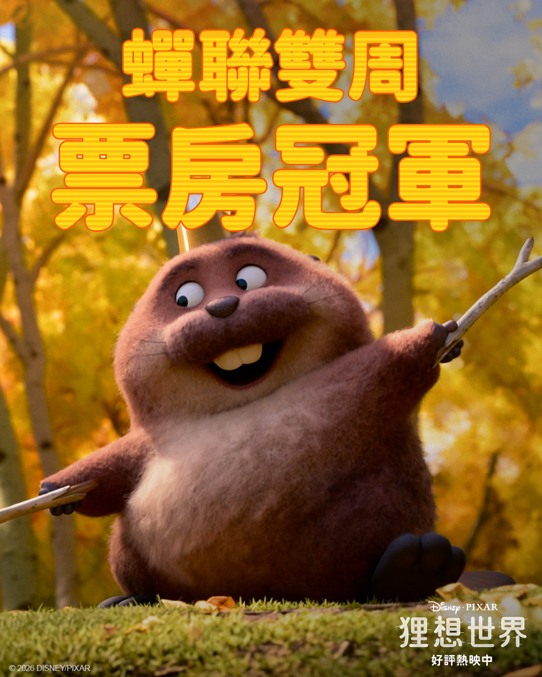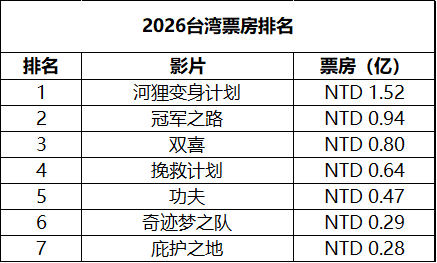 2026年第13周台湾票房 :1.《河狸变身计划》蝉联冠军,累计票房1.52亿新台币暂居2026新片票房冠军;2.《剧场版 暗杀教室 大家的时间》在新片中表现最佳;3.《阳光女子合唱团》累计票房7.6亿,超《疯狂动物城2》排名台湾影史第8;4. 《捕风追影》上映成绩不错,一举成为今年票房表现最好的大陆片。(单位:新台币 数据:台湾电影及视听文化中心)