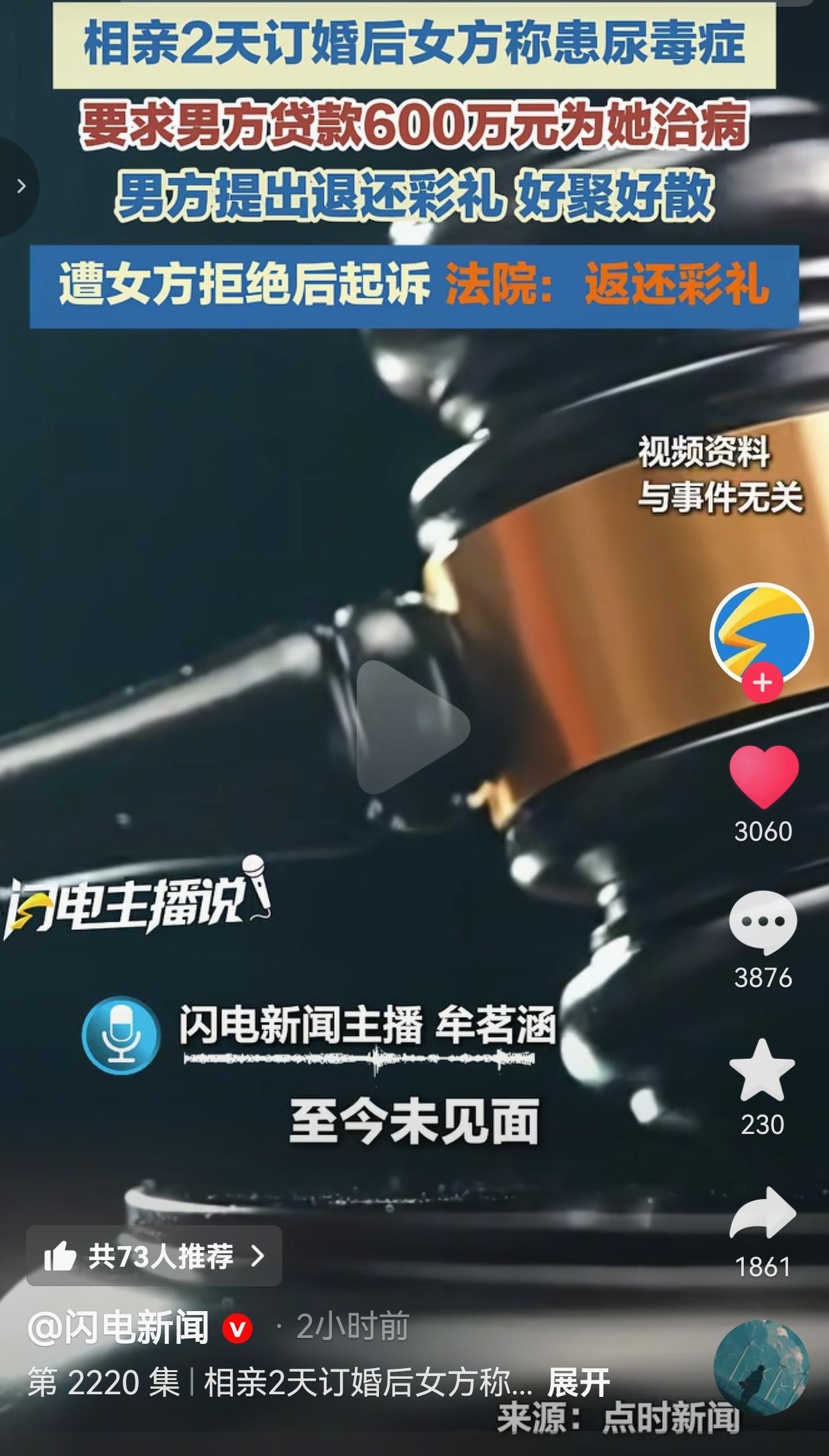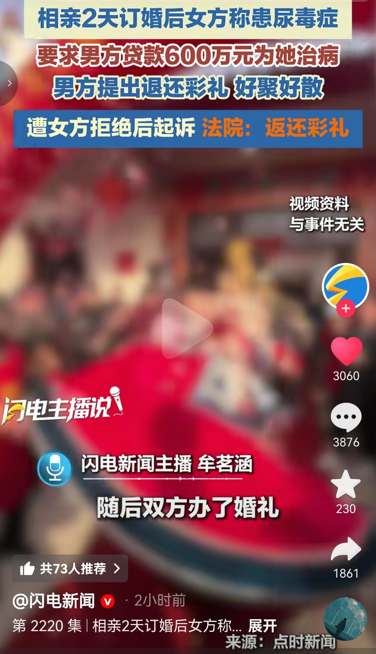 这哪里相亲结婚?这分明是把老实人当冤大头,往死里坑啊!相亲2天订婚,女方突然要男方贷款600万给自己治病!男方退婚要回彩礼,法院判了! 据中国裁判文书网实锤,河南的周先生,经媒人介绍相亲,和女方见了才2天,就火速订婚了。 紧接着两人办了婚礼,搬去一起生活,就是没领结婚证。 为了这场婚事,周先生前前后后掏了23.8万,彩礼、三金、车款,一分不少全给了女方,就盼着踏踏实实过日子。 结果呢?婚礼刚办完没多久,女方直接摊牌了:说自己得了I型糖尿病、尿毒症,一堆重病,要求周先生贷款600万给她治病! 周先生直接懵圈了!相亲2天订婚,你现在跟我说有尿毒症要我贷600万?这不是明摆着骗婚吗?他当场就提了退婚,要求女方把23.8万彩礼全额退还,好聚好散,谁也别耽误谁。 可女方直接翻脸了!钱到手了,死活不退,还放狠话:“退彩礼不可能,有本事你去起诉!” 说完直接拉黑了周先生,从此再也联系不上,至今都没再见面! 周先生被逼得走投无路,只能一纸诉状把女方告上了法庭。 最终法院判决:女方返还彩礼16.66万元!这结果大快人心,狠狠打了这种骗婚女的脸! 网友看到后评论说:这女的就是纯纯诈骗!相亲2天订婚,刚结婚就要600万治病,不是骗婚是什么? 也有的网友说:23.8万啊!普通家庭一辈子的积蓄!这女的良心被狗吃了? 还有的网友说:最恶心的就是这种,拿婚姻当幌子骗钱!法院判得太对了! 更有甚者说:兄弟们相亲一定要擦亮眼睛!这种闪电订婚的,全是坑! 要我说,这根本不是谈恋爱结婚?这分明就是一场精心策划的骗局!相亲2天就订婚,就是为了快速拿到彩礼,等钱一到手,直接摊牌要600万治病,你不贷就是你不对,你要退婚,彩礼就不退! 还敢放狠话让男方去起诉,转头就拉黑玩消失,把老实人的善良当软弱,把别人的血汗钱当自己的提款机,这种人简直坏透了! 你要是真有病,相亲的时候为什么不说?为什么要等彩礼到手了才说?为什么要让男方贷款600万给你治病?你这不是治病,你这是要把男方一家逼上绝路! 23.8万,对于普通家庭来说,那是父母一辈子的积蓄,是儿子结婚的全部家当,你说吞就吞,说不退就不退,真当法律是摆设? 还好法院是公正的!直接判女方返还彩礼,狠狠打了这种骗婚女的脸! 总有人说,彩礼给了就不能退,那也要看是什么情况!这种以结婚为幌子,骗取彩礼的行为,本身就是违法的!法律绝对不会纵容! 现在很多相亲市场,就是被这种人搞坏了!老实人想踏踏实实找个人过日子,结果被当成冤大头,被坑得血本无归! 我就想问这些骗婚的:你的良心不会痛吗?你拿着别人的血汗钱,花得安心吗? 婚姻是神圣的,不是你骗钱的工具!爱情是真诚的,不是你算计的筹码! 别拿别人的善良,当你作恶的底气!法律永远站在正义这边,坑人的,早晚要还! 骗婚的套路再深,也逃不过法律的眼睛;算计的心思再巧,也抵不过人心的公道! 彩礼有价,诚信无价;骗婚可耻,法律严惩!