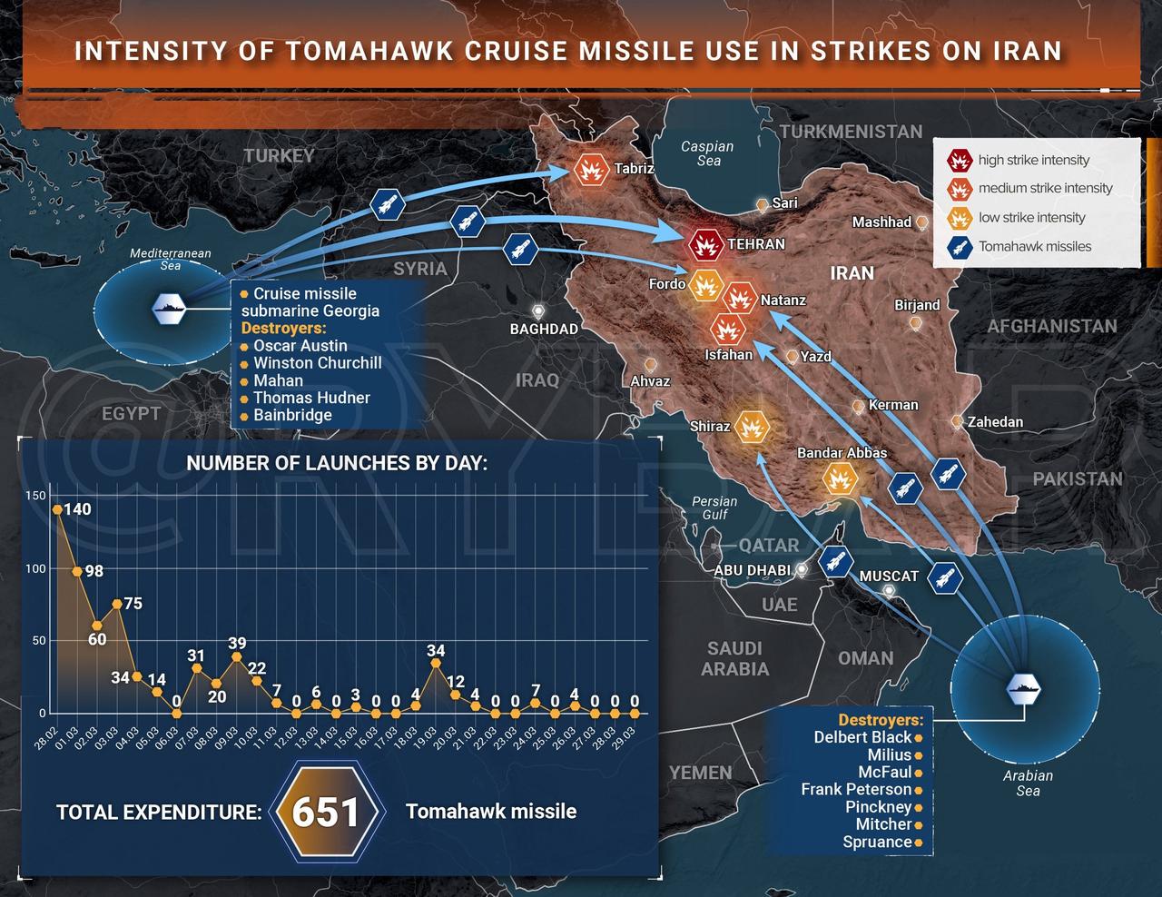 外网统计,开战前30天美以联军军机一共空袭了2400架次! 其中,舰载/潜射的“战斧”巡航导弹,一共发射了约650多枚。 有意思的是,最近一周每天的发射数量基本清零了。 外界猜测,大概率是两个航母打击群潜艇/驱逐舰上搭载的“战斧”发射完了。 打吧打吧,到时候面对东大应该就真的没库存了。