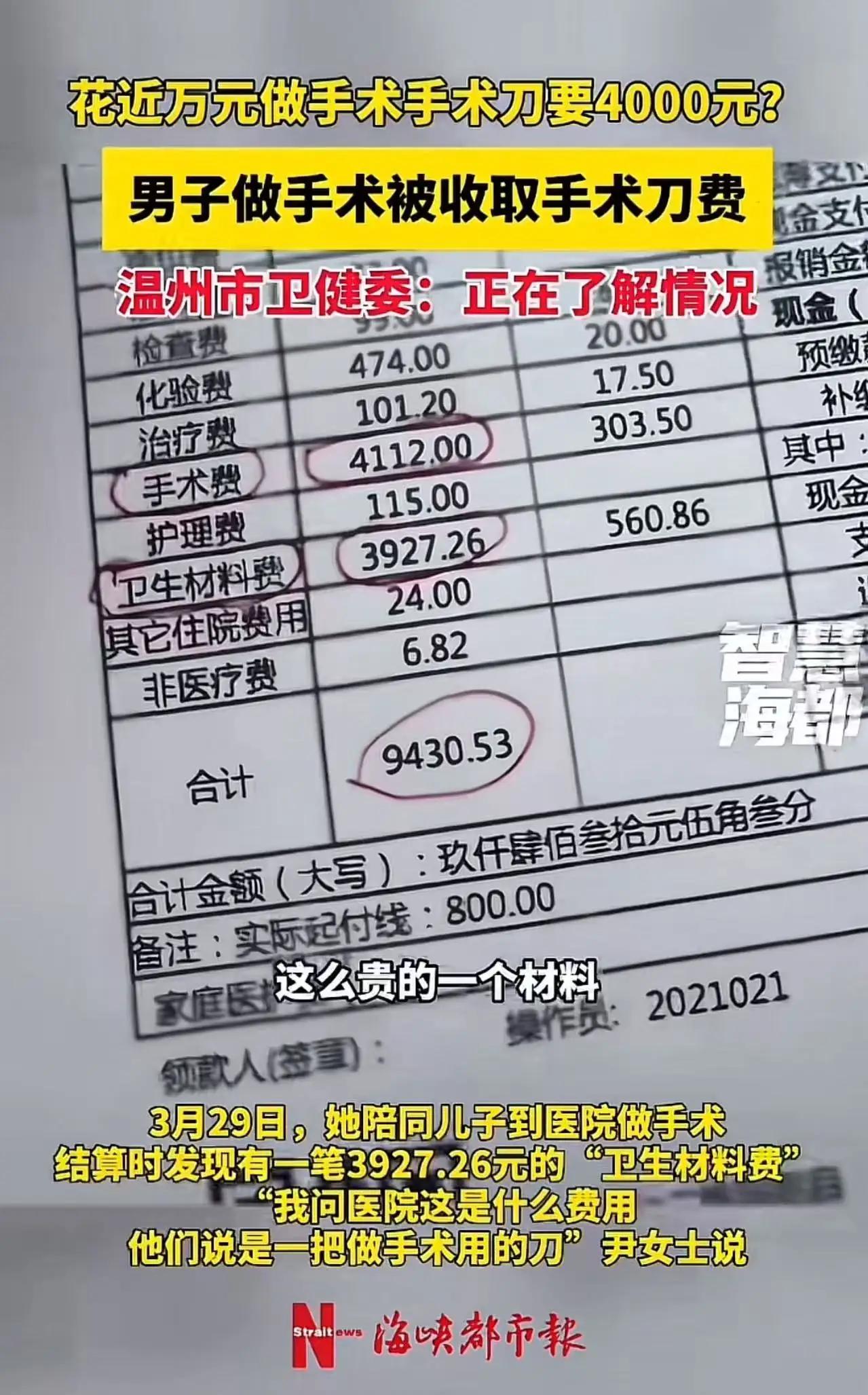 手术刀费四千元?别让“隐形消费”割了患者的信任 诸位朋友,今儿咱们单说一桩发生在温州医院的“天价刀费”奇案。这事儿,听着像“天方夜谭”,实则是一记狠狠抽在医疗透明度脸上的“响亮耳光”。温州的尹女士怎么也没想到,一场看似普通的鼻部手术,竟让她在结账时“破防”了。手术费四千一,手术刀费三千九,这哪是“治病救人”?分明是“买刀送手术”,让人防不胜防。 想当年,咱们总觉得“医者仁心”,进了医院就是进了“安全岛”。可这冰冷的现实却给了我们一记“当头棒喝”。尹女士的儿子做个鼻中隔矫正,全程无人提及这“天价耗材”,直到结账才知“惊喜”。医院一句“进口刀具,统一收费”,就想把这“先斩后奏”的锅甩得干干净净。这哪是“治病”?分明是“宰客”!患者躺在手术台上,就像待宰的羔羊,连选择用哪把刀的权利都被“刀”掉了。这种“账单突袭”,伤的不仅是钱包,更是医患之间那根脆弱的信任神经。 但这“愤怒”的背后,藏着的正是咱们今天要说的“大健康”警钟。真正的健康,讲究“内外双调”。外在,咱们得学会“明明白白消费”,别让那“信息不对称”成了健康的“隐形杀手”,知情同意书不能是“走过场”,每一分钱都得花在明处;内在,这“感恩之心”更是不可或缺。我们要感恩这“法治的阳光”,是它让“乱收费”无处遁形;更要感恩这“敢于较真的勇气”,它让我们明白,每一次理性的维权,都是在为更透明的医疗环境“添砖加瓦”。这种“维权有道”的通透,才是滋养身心的“灵丹妙药”。 我们要感恩这“时代的追问”,它虽带着阵痛,却让我们看到了重建医患信任的希望。 愿世间少一些“暗箱操作”的猫腻,多一些“阳光收费”的坦荡。 愿你我皆安康,前程皆似锦! 天价手术账单
