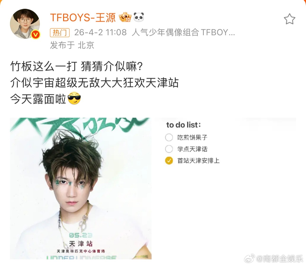 王源演唱会天津站官宣今日,王源2026年《宇宙超级无敌大大狂欢》巡回演唱会宣布首站落地天津!王源将于5月23日在天津奥林匹克中心体育场和小汤圆们一起狂欢。期待源儿讲点天津话!