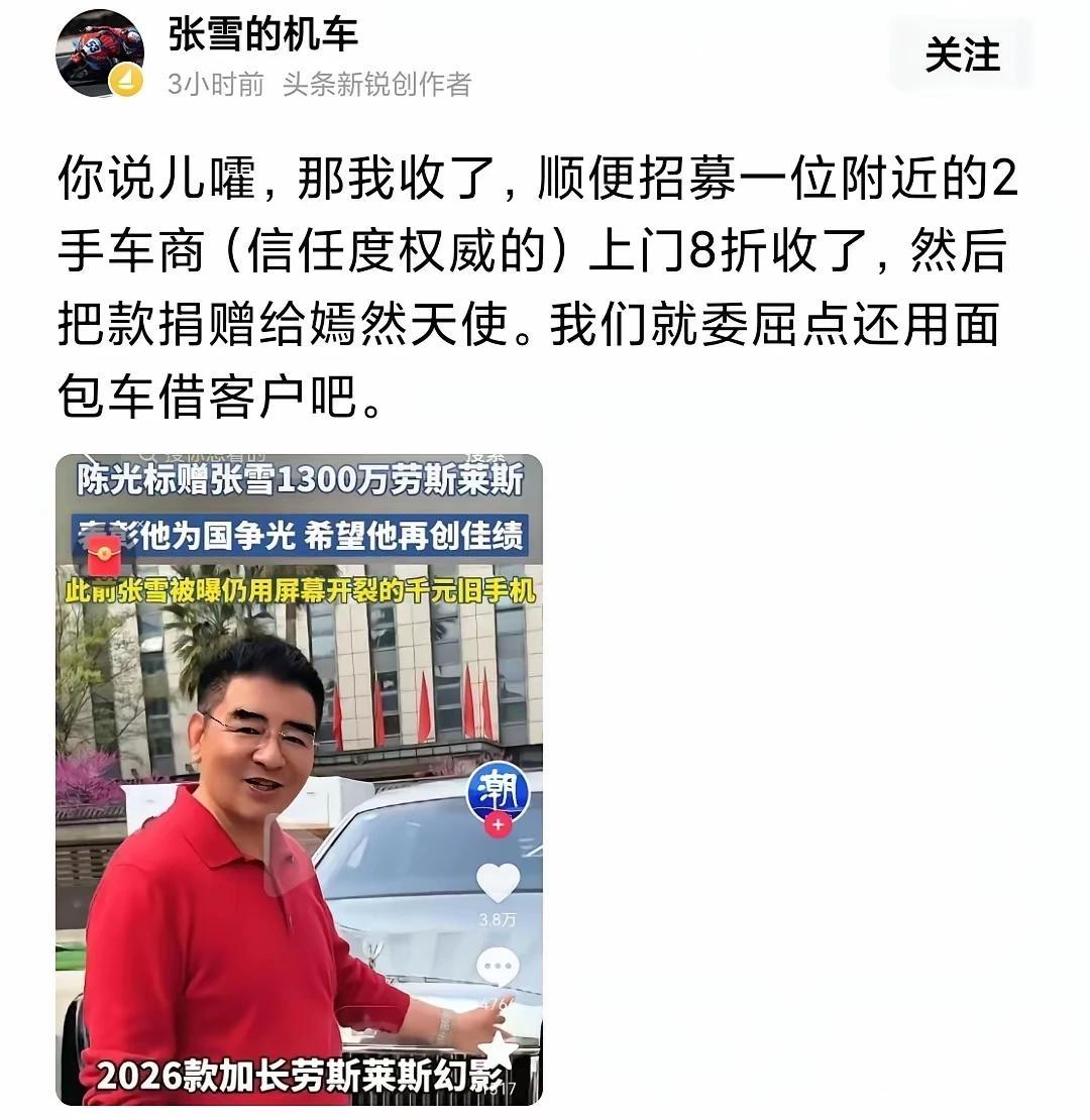 中国首善陈光标先生把价值1300万的最新款劳斯莱斯赠予张雪,用作接待用车。随后,张雪回应道:“既然是赠与,那我就收下了,我打算找个二手车商把它卖了,将卖车的钱捐给嫣然天使基金,我还是继续用面包车接送客户。我当初没买劳斯莱斯主要原因,是因为面包车能坐7个人,而这车只能坐5个人。” [泪奔]