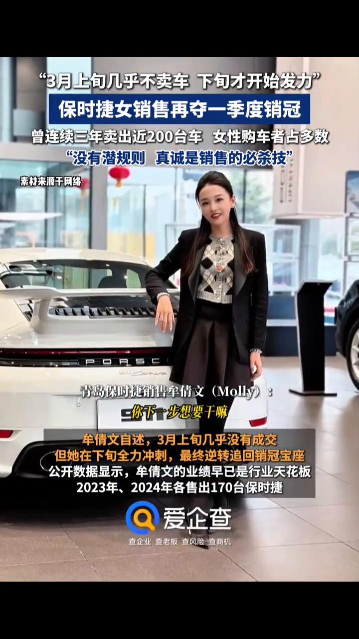 "3月上旬几乎不卖车,下旬才开始发力",保时捷女销售再夺一季度销冠,曾连续三年卖出近200台车,女性购车者占多数。"没有潜规则,真诚是销售的必杀技"。 青岛保时捷销售牟倩文(Molly):我是一个洞察力非常强的人,你一个小动作我就知道你下一步想要干什么。 4月1日,青岛保时捷中心销售顾问牟倩文(Molly)在社交平台宣布自己再度拿下2026年第一季度销冠,实现了1月、2月、3月的"月度三连冠",再次印证了其在豪华车销售领域的顶尖实力。牟倩文仍以192台销量逆势增长12.9%。 牟倩文自述,3月上旬几乎没有成交,但她在下旬全力冲刺,最终逆转追回销冠宝座。公开数据显示,牟倩文的业绩早已是行业天花板,2023年、2024年各售出170台保时捷。 我的客户60%-70%是女性客户,她希望我能够给她出很漂亮的照片,这种也是情绪价值,有的人天生就适合做销售。 爱企查App显示,青岛保时捷中心工商主体为青岛东保汽车销售服务有限公司,该公司成立于2009年7月,注册资本510万美元,经营范围包括保时捷及其他品牌汽车零售与批发,汽车维修等。股东信息显示,该公司由南京东保汽车销售服务有限公司、美东汽车销售集团有限公司全资持股。 如有侵权请联系删除。