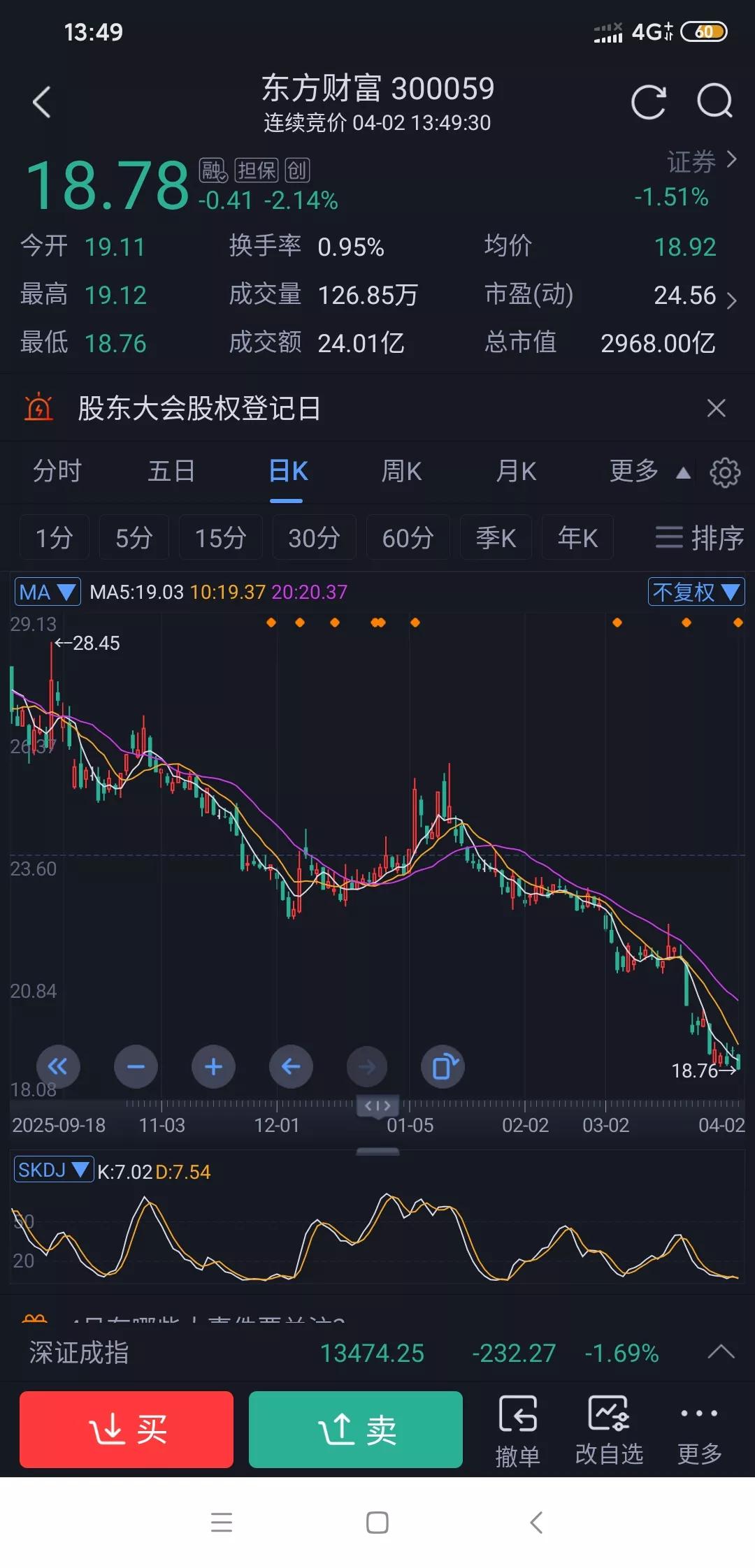 东方财富 天天新低,底在何处? 曾经被誉为 “券茅”东方财富最近一路阴跌不止,股价接连刷新年内新低,没有最低只有更低,大盘反弹它阴跌,大盘调整它领跌,100多万散户看来真的要哭晕在厕所了。 基金代销遇冷、业绩增速放缓、叠加资金持续流出,多重压力下股价节节败退。去年四季度业绩更是严重下滑 技术面持续走弱,均线空头排列,看不到明显止跌信号。实控人家族清仓式减持,套现超90亿,让市场担忧。流量竞争上,同花顺月活远超它,AI金融工具转型也慢。 这样的公司还值得持有吗? 你们被套的成本是多少呢? 东方财富行情