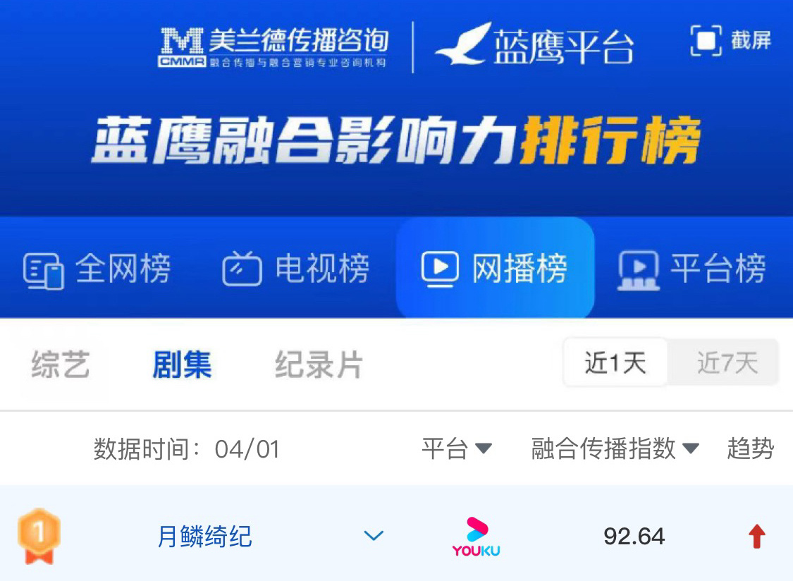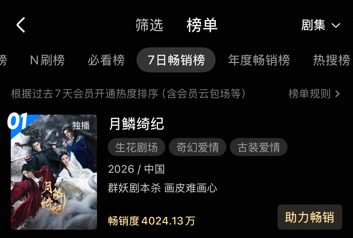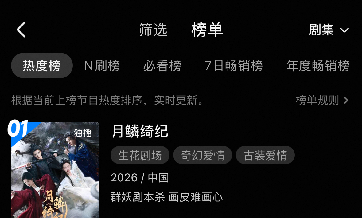 月鳞绮纪登顶月鳞绮纪热度破7000 还好我从这剧开拍的时候就跟了它,看了月鳞绮纪 我只能给到一个夯爆了,从剧情到演员再到特效只能说全平台数据登顶,热度破7000,这是你应得的!补药放过这个《月鳞绮纪》,今天中午接着来追!