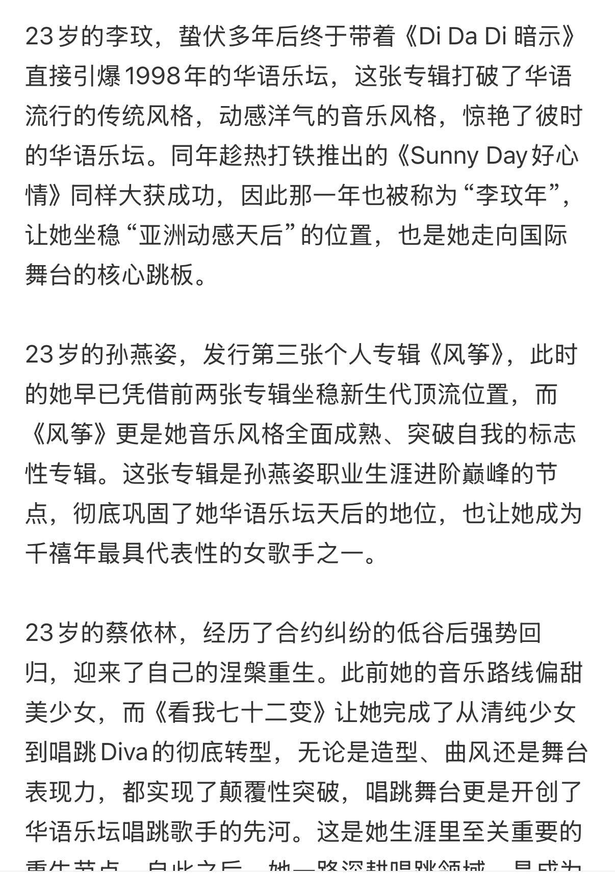 华语天后在单依纯的年纪都在干什么 有网友盘点华语天后23、24岁的时候在干什么,并表示这些华语天后们,在同样的年纪,有人出道即巅峰,有人历经摸索,终于迎来转型与爆发;也有人稳步发展,在上升期的快车道一路前进。大家认同吗?