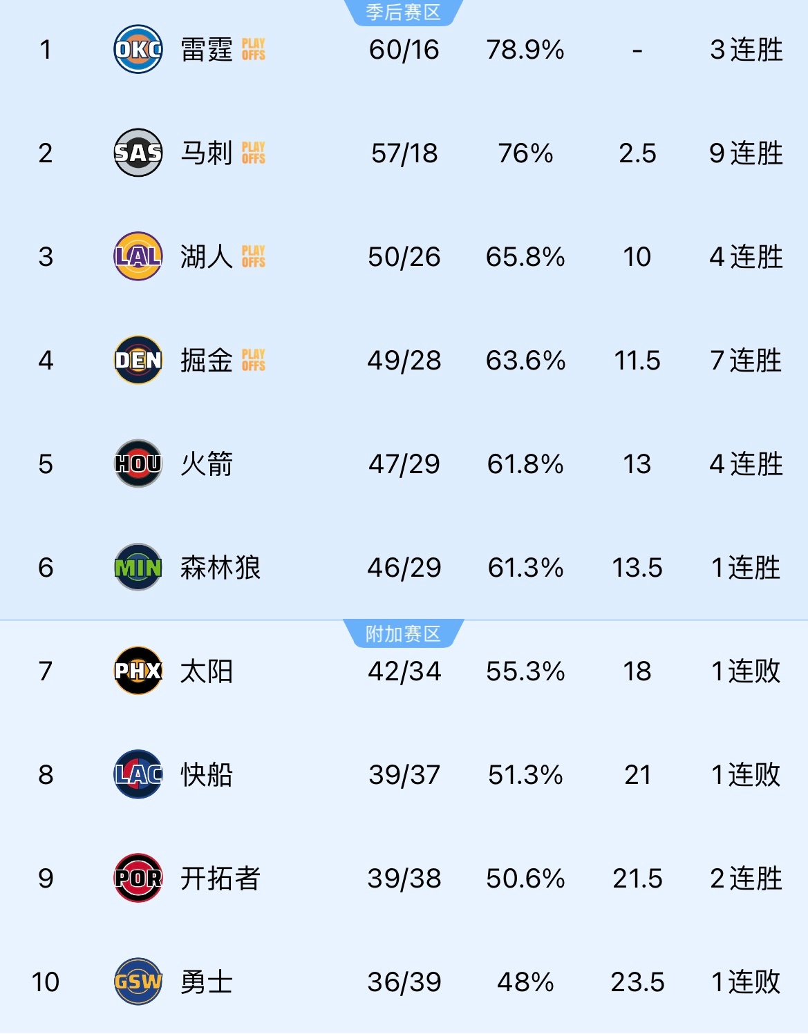 掘金击败爵士获得7连胜,西部前5都是连胜。湖人西部第三的位置还需要继续稳固住。