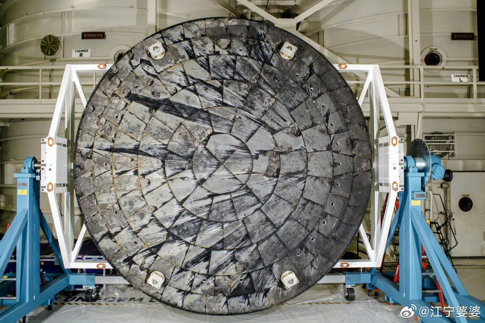 在阿尔忒弥斯1号任务结束后,NASA发现飞船返回时最为重要的底部隔热罩出现了远超预料的磨损甚至可以说是破坏(图三图四)。经过排查发现,造成这种情况的原因是隔热罩材质过于致密,导致隔热罩在与大气层长时间摩擦时气泡被挤压在隔热罩上造成无数极小规模的“空爆”,最终给隔热罩带来了远超预料的破坏。