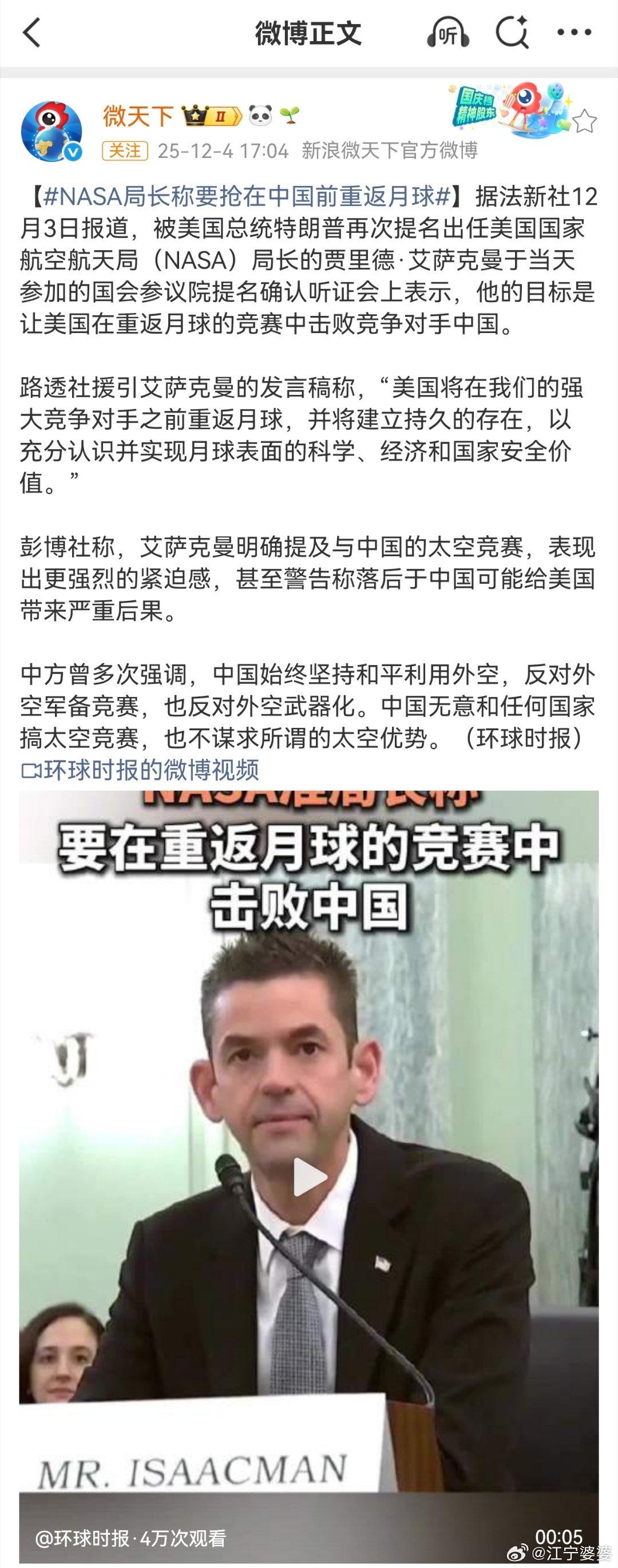 所以目前情况就是这么个情况了。如果美国人还是发个无人探测器去绕月,我乐得看各种乐子。但是现在猎户座上面有四个大活人,我真心希望阿尔忒弥斯2号任务能够圆满成功,平安返航。如果成功的话,希望美国人能稍微喘口气,不要再为了强行和我们竞争拿人命赶进度了,我们的太空计划都是几十年前制定的,没和你比啊,你非要和我们比干嘛呢,你五十年前都去过月球了,你早都赢了啊。