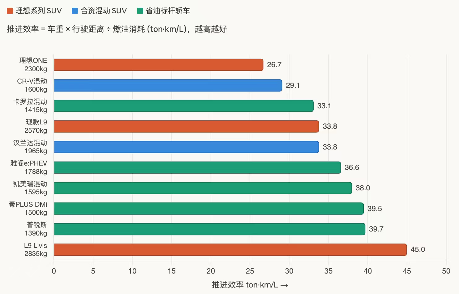 理想L9 Livis,车重2835kg,推进效率45.0 ton·km/L,比卡罗拉混动(33.1)高36%,比混动鼻祖普锐斯(39.7)高13%。