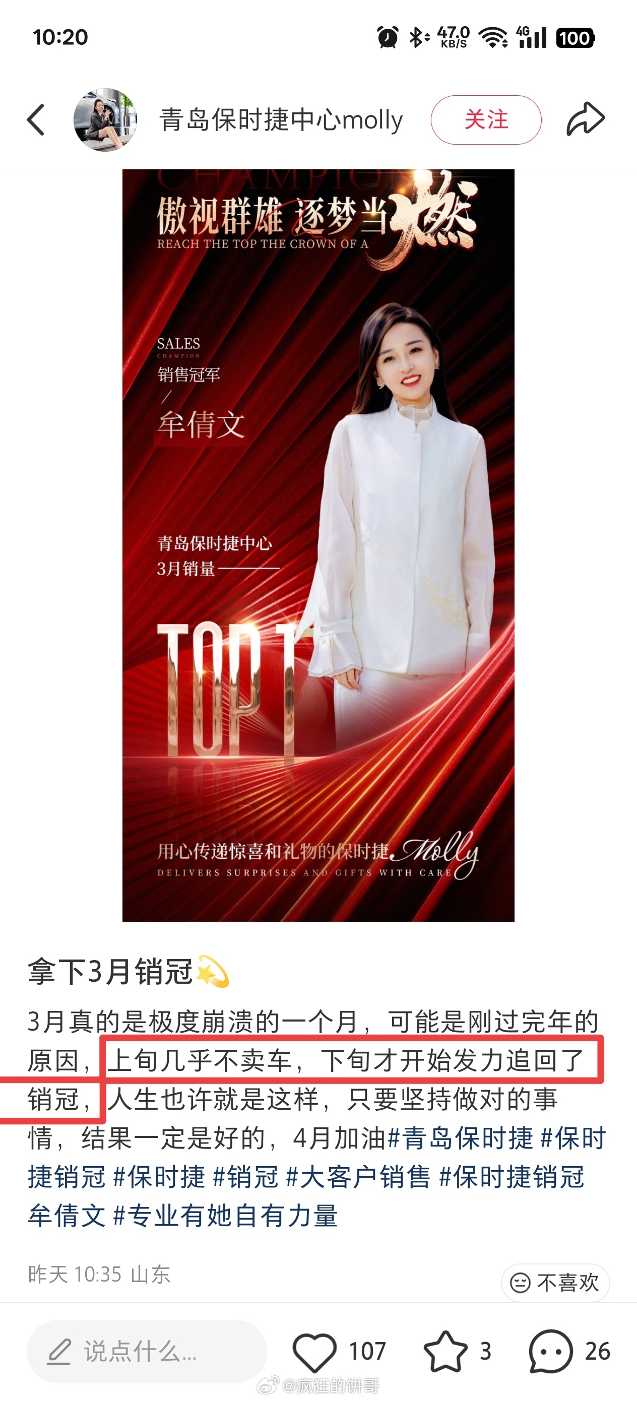 她说3月上旬几乎不卖车,下旬才开始发力,追回了销冠,就这一句话,说清楚了两件事:
