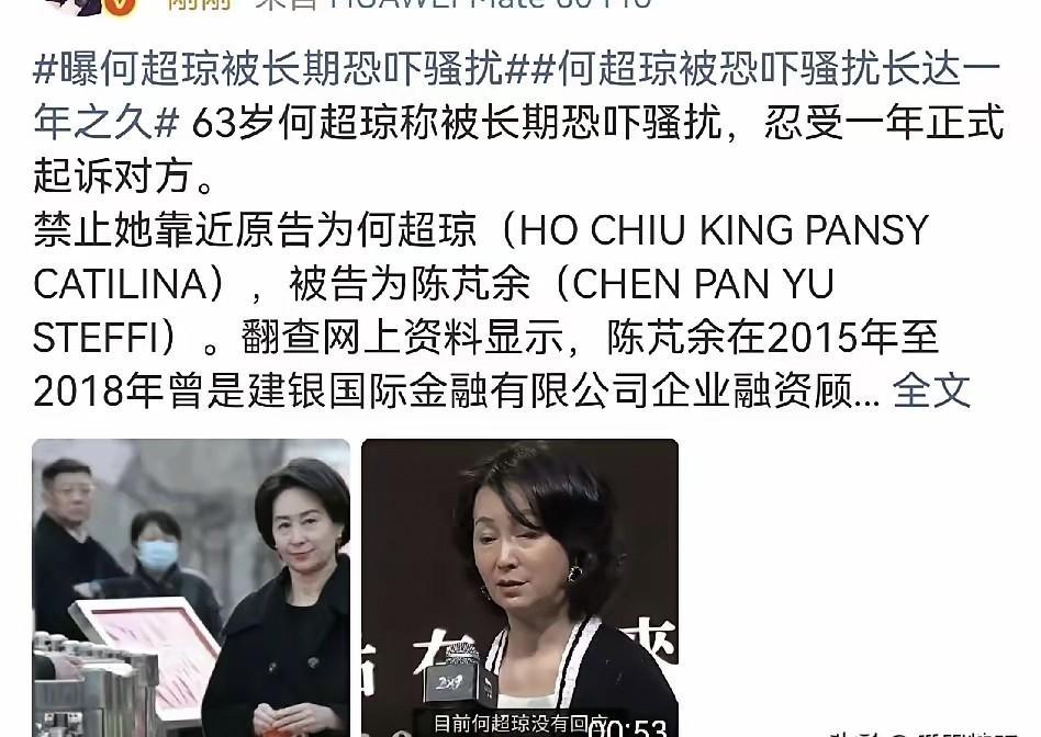 何超琼把她告了。 只为禁止靠近自己30米。 这位赌王家族的话事人,掌控千亿商业帝国。 出入保镖随行,决策牵动市场。 可这个掌握巨大能量的女人,过去一年,却被一个人,堵得寸步难行。 一纸诉状递进法院,诉求简单到令人错愕——别再来我公司附近,别联系我,什么都别说。 骚扰她的人,叫陈芃余。 一个普通的香港前金融顾问。 牌照早已过期,住在荃湾的普通住宅。 公开记录里,两人此前毫无交集。 但就是这个人,从去年三月开始,精准地出现在何超琼的世界里。 法庭文件没写具体方式,只说了“持续骚扰恐吓”。 整整一年,何超琼没公开喊过一声。 直到今年三月最后一周,她才选择最文明也最笨拙的方式——法律。 她要求划出一条清晰的线。 白纸黑字写明,禁止对方踏入信德中心办公室三十米内。 三十米,大概是一个走廊加一个转角。 对何超琼来说,这是她每天处理文件、主持会议的半径。 如今,这个半径需要法庭来保护。 一个前金融职员,为何执着骚扰顶级富豪? 没人知道动机。 没有勒索记录,没有商业纠纷。 就像一颗不知从哪飞来的石子,偏偏砸中了最厚的玻璃。 这事戳破一个真相。 再坚固的堡垒,也有钥匙打不开的锁。 何超琼可以调度资金,影响政策,却在面对一个陌生人的偏执时,只剩下报警和起诉这两个选项。 权力与脆弱,原来可以如此荒谬地共存。 法律成了最后那堵墙。 它不问你为什么,只告诉你不可以。 那些看不见的纠缠,最终都要落在“三十米”这样具体的数字上,才算有个了断。 你看,文明社会解决问题的方式,有时显得很笨。 但这也是它可贵的地方——它承认有些冲突没有道理可讲,于是干脆不讲道理,只画底线。 这世上最锋利的武器,往往不是权力,而是执念。 你永远不知道,谁正默默丈量与你那30米的距离。我要上精选-全民写作大赛
