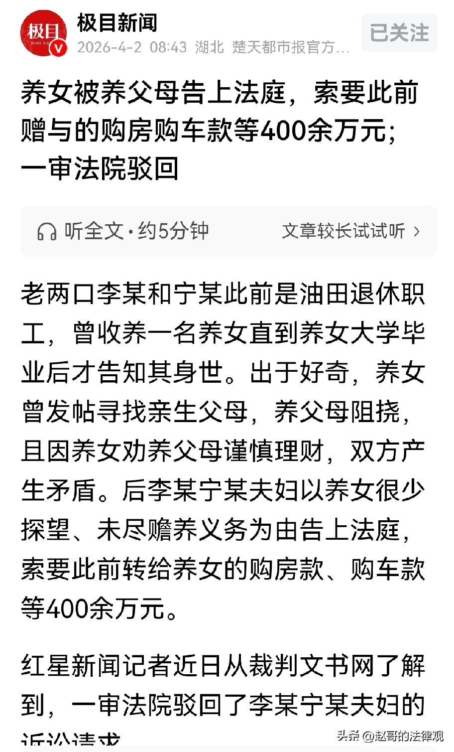 亲情终归败给了金钱!山东,一对夫妻,多年前收养了一名刚满月的女婴,从此视如己出,并倾尽所有送她出国留学,后来夫妻俩买了4套房子、20万买轿车,都写在养女名下。直到养女大学毕业,老两口告诉她实情,本以为养恩大于生恩,这份爱足够厚重,却不料,养女竟偷偷寻找亲生父母,老两口伤心不已,从此双方心生隔阂。于是老夫妻将养女告上法庭,索要购房款、购车款等共计400余万元,不料,法院判决,令老两口大失所望! 小李刚满月就被抱养,从小到大备受父母宠爱。 因养父母都是油田员工,家庭条件优渥,她从小就比普通家庭的孩子生活的好。 小李长大后,养父母花费大量资金送她出国留学,直至回国后结婚生子,对她都是倾尽所有。 老两口曾在多处,买下4套房产,都登记在养女小李的名下。 后来老两口又拿出20多万,给小李买了一辆车。 小李起初并不只知道自己的身世,就像亲生女儿一样,对父母照顾的相当周到。 小李大学毕业后,老两口觉得,女儿长大了,应当让他知道自己的身世。 本以为,养恩大于生恩,按说,小李得知自己的身世,应该更加感激养父母的恩德。 然而,不知出于怎样的想法,小李开始在网上发帖,试图寻找亲生父母的线索。 老两口得知后,心里像扎了一根刺。 老两口觉得,自己几十年的含辛茹苦,竟抵不过那虚无缥缈的血缘。 挫败感和不安与日俱增,他们开始阻挠女儿寻亲,言语间的摩擦逐渐增多,父女母女间有了隔阂。 真正的裂痕,源于一次的建议。 老两口退休后,手里攒了些钱,除了全国各地去旅游,他们还迷上了买理财产品。 前后投进去500多万,小李知道后,觉得风险太高,劝他们赶紧收手,把钱存银行,别把养老钱打了水漂。 本是女儿出于好意,可这话在老人听来却变了味。 他们觉得女儿是嫌弃他们老了、糊涂了,甚至怀疑女儿是不是惦记着他们的存款,想掌控他们的经济。 一来二去,双方产生了矛盾,心里都憋着一股气。 这次争吵,也成了压倒骆驼的最后一根稻草。 两位老人觉得,自从女儿知道身世后,就不听话了,连自己辛辛苦苦给她攒下的家业,她都要指手画脚。 愤怒和失望之下,老两口一纸诉状递到法院。 他们说:现如今老两口老体衰,生活不能自理,养女开始嫌弃他们了。 令他们心寒的是,去年父亲生病住院,小李仅转账2万元,后来又要回去了。 平时养女也很少探望老两口,不愿尽赡养义务,他们对这份亲情很失望。 李某和宁某夫妇,请求法院判令养女,返还向其赠与的购房款3745248元、买车位款151300元、购车款200000元、转账40000元,合计金额4136548元。 而养女小李却辩称,自己对养父母的养育之恩从未敢忘。 那些房子和车,都是父母当年主动要给她买的,父母说,这一切迟早都是你的,她才收下。 至于那2万块钱,是因为父亲住院,她第一时间转过去的,后来母亲打电话说,他们有医保,不缺钱,让她留着用。 她才收回了,根本不是索回。 她当庭出示了多年的转账记录,从2014年到2025年,她给父母转账超过50万元。 只是父母心疼她,常常又把钱退回来。 逢年过节,她更是礼物不断,电话问候从没间断。 聊天记录里,最多的也是对父母嘘寒问暖的叮嘱。 小李承认,自己曾因寻找亲生父母与养父母产生矛盾。 自己劝他们理财惹他们生气,但这不是不孝,更不是要抛弃他们。 父母给予的财产和钱款,赠与早已完成,是父母自愿的,没附加任何条件。 《民法典》第663条规定:“受赠人有下列情形之一的,赠与人可以撤销赠与: (一)、严重侵害赠与人或者赠与人近亲属的合法权益; (二)、对赠与人有扶养义务而不履行; (三)、不履行赠与合同约定的义务。 赠与人的撤销权,自知道或者应当知道撤销事由之日起一年内行使。” 法院在审理后认为,老两口给女儿买房买车,是基于亲情的赠与行为。 钱款一旦交付,赠与就已生效。 虽然法律规定,受赠人对赠与人有扶养义务,而不履行的,赠与人可以撤销赠与。 但在本案中,根据养女小李提供的聊天记录,转账记录等证据证明,双方虽然有矛盾,但并未断绝来往。 养女也尽到了关心和赡养义务。 老两口认为养女,有扶养义务而不履行,但证据不足,法院因此驳回了他们的诉讼请求。 官司打输了,小李也没有返还养父母索要的400多万。 曾经最亲密的一家三口,这份亲情的重量,又岂是金钱能够称量的。 就像老话说的:生而不养,断指可报,生而养之,断头可报;未生而养,百世难报。 希望双方,恢复曾经的那份亲情,并延续下去。 对此你怎么看? @赵哥的法律观,欢迎评论区发表您的看法。