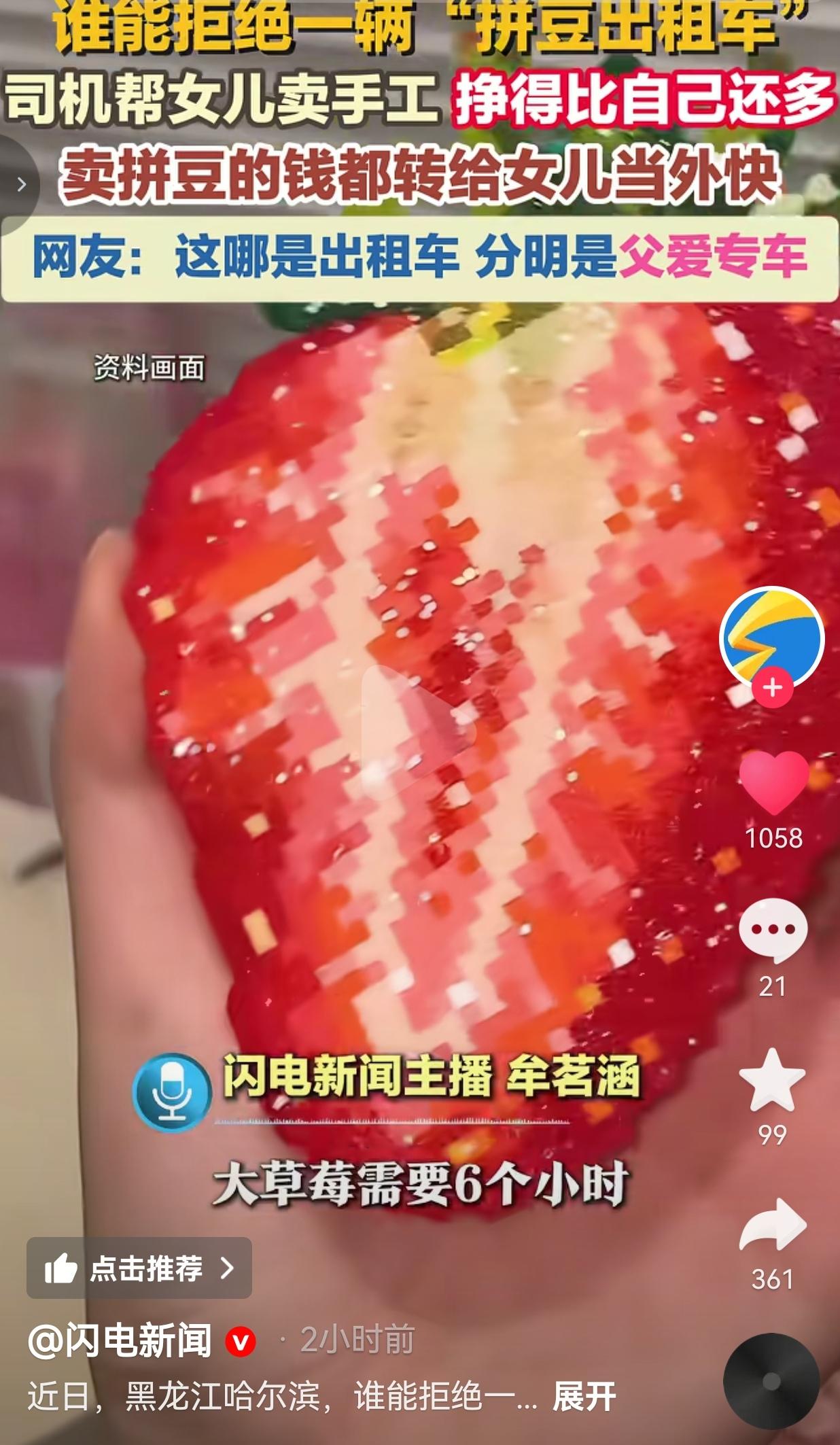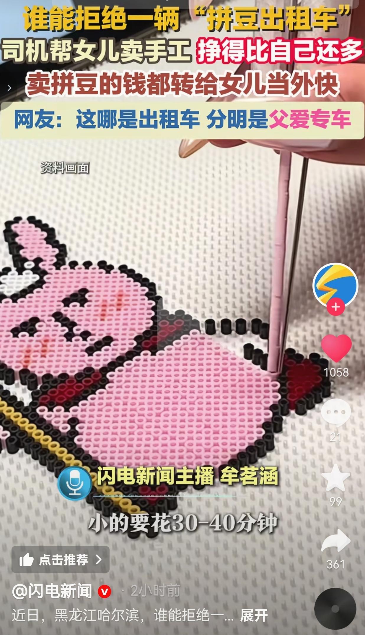 谁能拒绝一辆挂满拼豆的哈尔滨出租车?司机大哥帮上高中的女儿卖手工,赚得比开出租还多,乘客10元车费转头买93元拼豆,这哪是出租车,分明是载满父爱的移动幸福站啊! 近日,黑龙江哈尔滨一辆挂满可爱拼豆挂件的出租车意外走红,成了当地新晋“网红打卡点”。 司机大哥每天出车时,都会把女儿纯手工制作的拼豆饰品满满当当地挂在车里,一边跑营运一边帮女儿卖货。 更让人意外的是,他靠这些拼豆赚的钱,居然比自己开一天车的收入还多,而且卖拼豆的钱他一分不少,全部转给女儿当零花钱,连个零钱都不扣。 这些拼豆可不是随便做做的,全是大哥上高中的女儿亲手打磨出来的。 小的卡通挂件要花三四十分钟才能拼好,像大草莓这种稍复杂的款式,女儿得整整忙活6个小时才能完成。 每一个拼豆都带着女儿的巧思和心血,软萌可爱的造型,不管是小朋友还是大朋友看了都忍不住心动。 大哥说,有时自己又出车又出力忙活,挣得还不如闺女多,但他一点都不觉得亏,反而特别骄傲。 有个乘客的举动更是让他印象深刻:坐一趟车只花了10元车费,转头就掏钱买了93元的拼豆,把大哥都逗得直呼“崩溃”——不是真的崩溃,是开心女儿的手艺被认可的那种无奈又欢喜。 网友看到后评论说:哈尔滨这出租车我必须去蹲!不为坐车,就为买拼豆!这哪是拼豆,这是爸爸把女儿的热爱捧在手心里卖啊! 也有的网友说:对比一下,有的家长嫌孩子做手工耽误学习,人家爸爸直接开“移动专柜”支持,这父爱真的太顶了! 还有的网友说:10元车费换93元拼豆,这不是消费,是给父爱买单!谁能不被这种真诚的父爱打动啊! 说实话,现在太多家长把“成绩第一”刻在脑门上,孩子的爱好在他们眼里全是“不务正业”,要么嫌浪费时间,要么嫌耽误学习,从来没想过孩子的热爱有多珍贵。 可这位出租车司机大哥不一样,他没讲什么大道理,没逼着女儿放弃手工去死磕成绩,而是用最实在的方式给女儿撑腰。 他把女儿的作品挂在自己的出租车上,帮女儿把热爱变成实实在在的收入,一分不留地转给孩子,让女儿清晰地知道:你做的东西有人喜欢,你的努力有价值,爸爸永远是你最硬的后台。 这才是最动人的父爱啊,不是给孩子买多贵的礼物,不是说多动听的情话,而是尊重孩子的热爱,守护孩子的小世界,用自己的肩膀,给孩子的爱好搭起一座桥。 多少人小时候的爱好,都被父母一句“没用”给浇灭了;多少人长大后,都遗憾没有一个支持自己热爱的父母。而这位大哥,用一辆出租车,给女儿撑起了一整个充满光的天地。 这哪是拼豆出租车,这是妥妥的父爱专车,是移动的幸福站啊! 父爱最动人的模样,从来不是惊天动地,而是把孩子的每一个小热爱,都当成自己的大事,拼尽全力去守护。 对此,你怎么看?