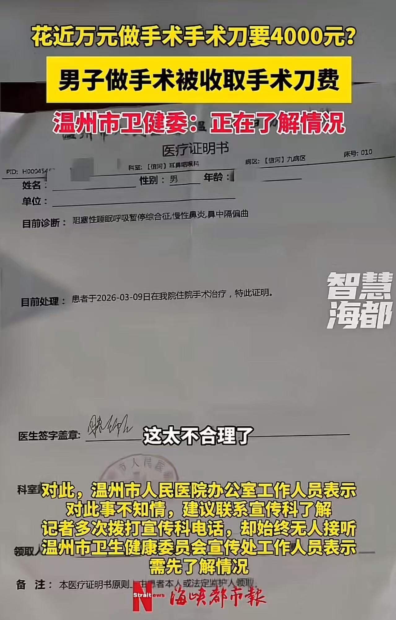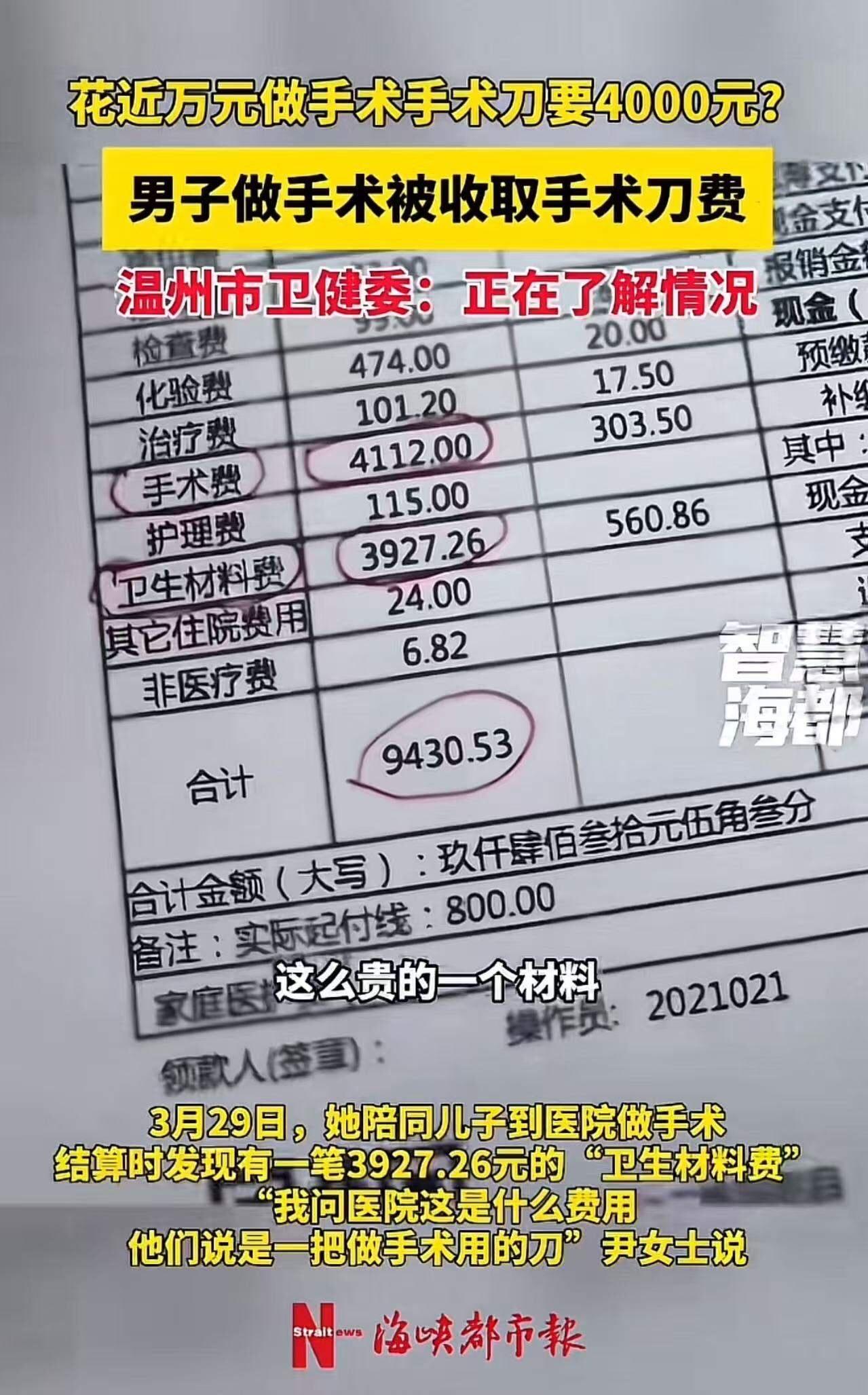 “孩子花近万元做手术,手术刀要4000元?”孩子妈妈:“已经给了手术费了,还收手术刀的费用,怎么可以要别人自己带刀呢?”网友炸锅! 温州的尹女士怎么也没想到,一场看似普通的鼻部手术,竟让她在结账时“破防”了。 温州的尹女士怎么也没想到,一场看似普通的鼻部手术,竟让她在结账时“破防”了。 “孩子花了近万元做手术,结果手术刀还要单独收4000元?”尹女士一边说着,一边气得几乎要哭出来。她告诉记者,手术费早已在之前的交费单中体现,怎么还能另收“手术刀费”?更令人无法接受的是,医院竟然要求家属自行携带手术刀,这在她看来简直匪夷所思。 这起事件迅速在网络上引发热议,网友们纷纷表示震惊和不满。有人吐槽:“这是什么时代了,还让患者自己带手术刀?这不仅不专业,简直是对患者的二次伤害!”更有网友调侃:“下次手术是不是还得带自己的绷带和消毒水?”一时间,各种质疑和愤怒的声音充斥网络。 但如果我们冷静下来,试着透过现象看本质,或许能发现更深层次的问题。为何医院会出现这种“分项收费”,甚至让患者自己带手术器械的怪象?背后到底隐藏着怎样的利益链条和管理漏洞? 首先,这反映出医疗资源配置的不均衡和医院管理的混乱。在公立医院日益紧张的财政压力下,部分医院通过“收费项目拆分”来增加收入,已经不是新鲜事。手术费看似包括了一切,但实际上各项耗材和器械费用被拆开单独计费,患者最终承担的费用远远超出预期。 其次,医院要求患者自带手术刀,或许也是因为医院自身的器械供应短缺,或者是为了降低成本转嫁给患者。这种做法不仅增加了患者的经济负担,更暴露出医疗体系在保障患者权益上的缺失和制度漏洞。 更重要的是,这件事激起了我们每个人对医疗公平和尊严的思考:当医疗变成了一场“买卖”,当患者被迫承担本应由医院统一负责的耗材费用,我们还能信任我们的医疗系统吗?当一个孩子的手术花费几乎被“分割”得面目全非,家长的焦虑和无助又该如何安放? 尹女士的经历,正是千千万万个普通家庭在面对医疗费用时的缩影。他们不求豪华,只希望孩子能得到安全、放心的治疗;他们不求优惠,只想公平对待;他们不求特别,只愿安心。 这场风波,或许将推动更多人关注医疗收费透明度,呼吁监管部门加强规范,保障患者权益。也提醒我们,每一笔费用背后,都是一个家庭的希望与重担。 孩子的健康,是无价的。医院的责任,是守护生命的神圣使命。希望这样的“手术刀收费”事件,能成为警钟,让我们共同推动医疗环境的改善,让每个家庭的付出都能换来真正的安心与信任。 你怎么看?你身边是否也有类似的经历?欢迎在评论区分享你的故事,让更多人听见这份声音。天价手术账单 手术账单 手术明细 中医手术刀 儿童手术风险 父亲手术费用 女儿手术费用