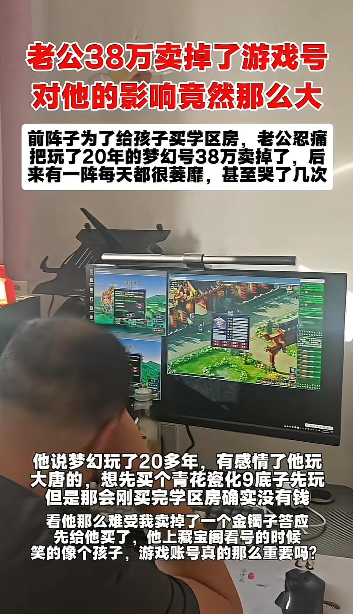 老公卖掉38万游戏账号情绪崩溃,这事儿换谁都得难受。就像河北那小伙,玩7年《梦幻西游》手游,“氪金”8万,卖了32万还买了房,这是幸运的。但要是自己的心血账号被卖,可就糟心了。 之前有人把账号给别人玩8个月就被卖了,这属于无权处分。要是沟通不成,还得收集证据起诉索赔。游戏账号凝聚着玩家的时间和情感,38万的账号被卖,老公崩溃太正常了。账号交易还是得谨慎,不然就可能遭遇这种糟心事。