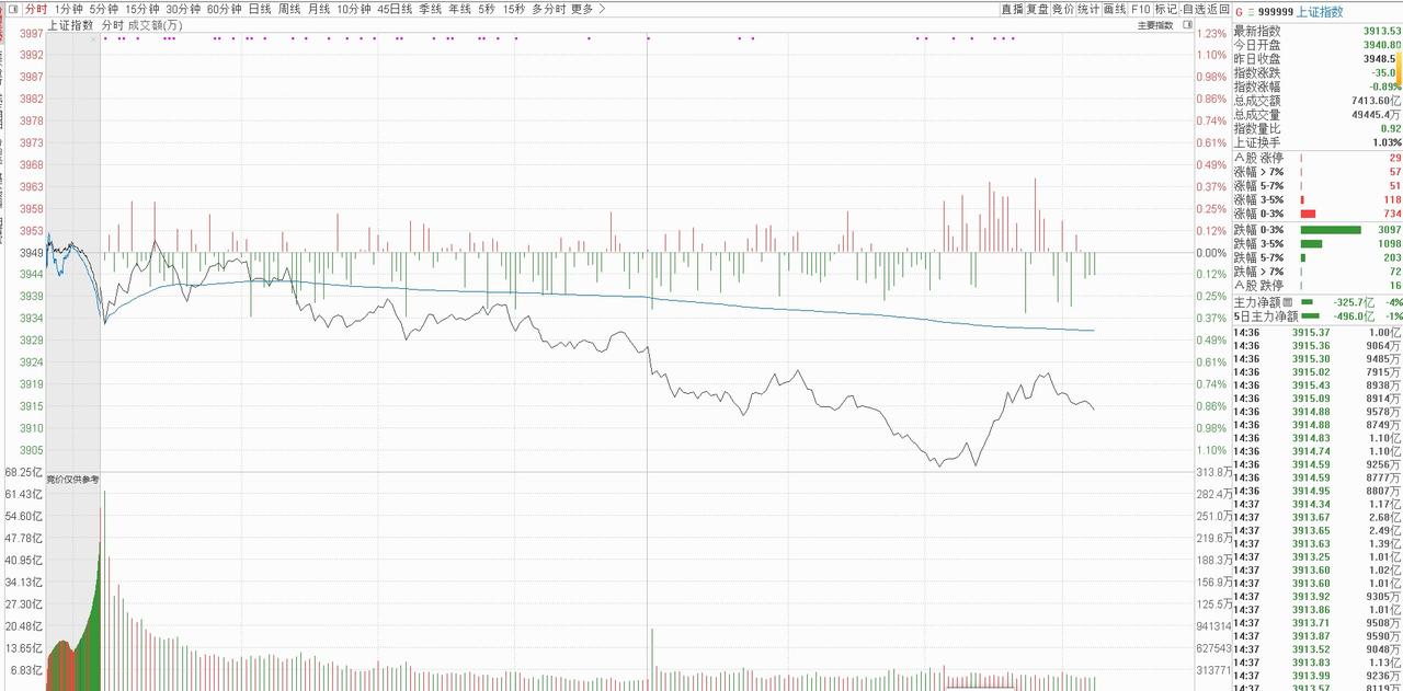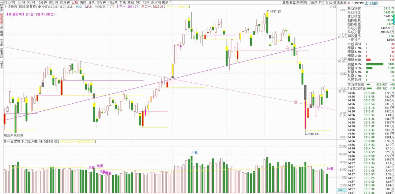 4月3日大盘走势前瞻:明天(2026年04月03日)星期五的大盘走势: 今天大盘走出了一波看似波澜不惊,实则暗藏玄机的行情。开盘跳低至3940点后,大盘短暂冲高回落。 早盘9点31分上穿人线,9点40分突破零轴,看似强势的上攻却在9点41分戛然而止,尖角波的出现成为了行情反转的信号。根据量学理论,尖角波往往意味着股价“从哪里来回哪里去”,果不其然,大盘随即冲高回落,相继跌破零轴与人线。此后,大盘在人线附近反复纠缠,多次上碰却始终无法有效突破,11点24分更是走出了龟背行情。量学中早有定论,龟背行情出现时,大盘真底会逐步下移,再配合人线的持续向下倾斜,市场弱势格局已然确立。尾盘14点11分再次出现的尖角波,进一步印证了当天分时走势的不健康。 今天大盘最高上探至3952点,与此前划定的中线3942点仅相差10个点,上攻力度明显不足;而最低下探至3900点,触及0323阴元帅柱的上三一位,获得支撑。昨天的收盘使得0327成为王牌柱,且大盘始终在太极线B上方运行,大盘目前处于安全区间。 明天的盘前三线:上线3956点,中线3915点,下线3885点。 目前市场量化大行其道,散户在短线交易中毫无优势可言。量化交易凭借其高速运算能力与精准算法,总能在短线行情中抢占先机,别盲目跟风,容易被沦为收割对象。