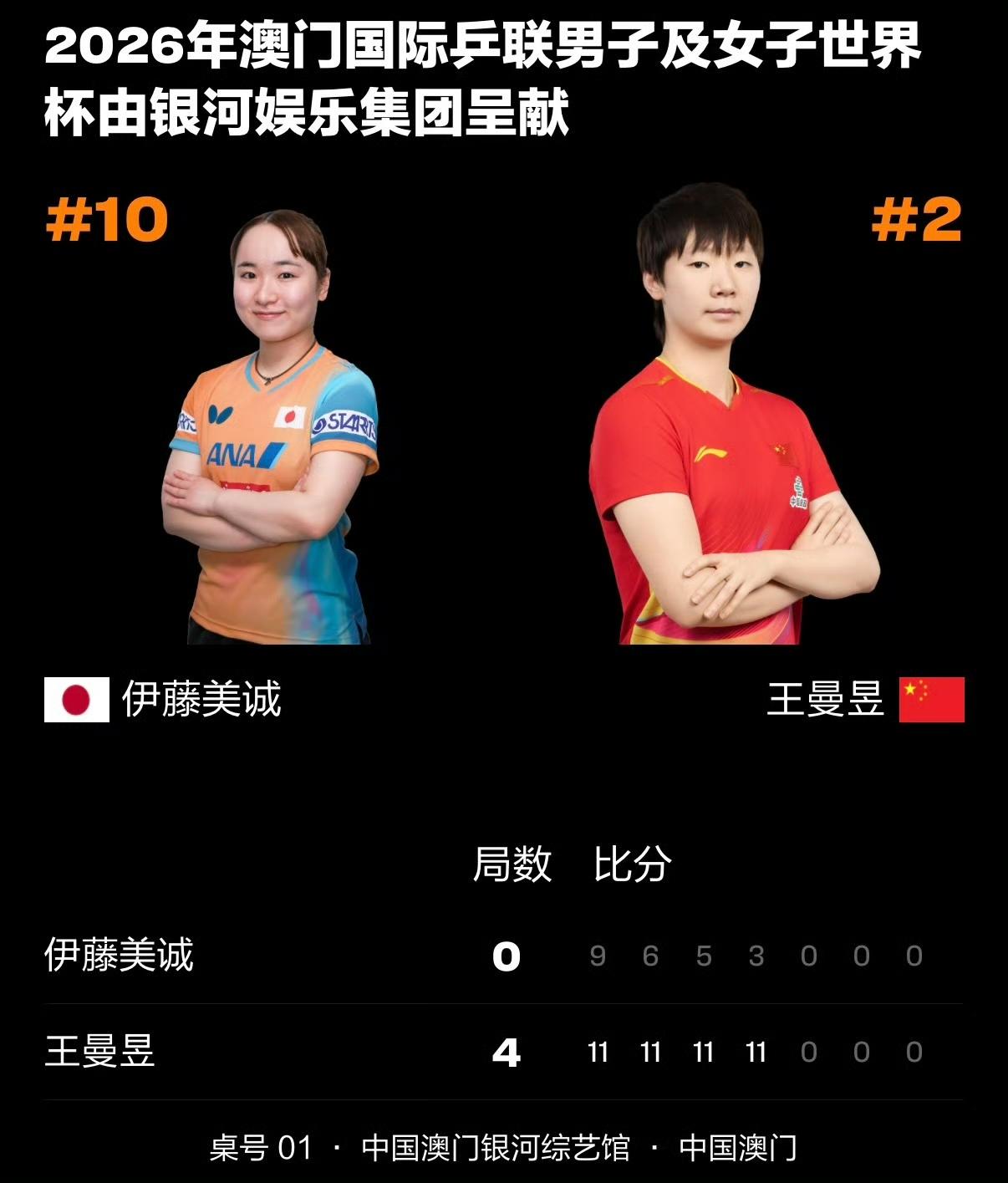 大心脏的王曼昱,吓了所有人一跳! 4月2日下午,澳门世界杯淘汰赛首轮,国乒王曼昱4-0横扫日本对手伊藤美诚晋级8强。 7局4胜制的比赛,第一局开局时的王曼昱让所有人一惊。开局0/6落后,当所有人都认为这将是一场苦战的时候,大心脏、不慌不忙的王曼昱,在接下来的时刻,给所有人吃了一记定心丸,也拉开了对手崩溃的序幕。 从0比6落后,到6比6追平,从6比8落后,再到8比8追平,最后8比9在落后一刻,王曼昱连得3分直接拿下胜利,那一刻,真的太燃了。 从这一刻开始,接下来的时间,王曼昱让国迷开始放心的享受比赛,而也正是从这一刻开始,日本选手伊藤美诚连续崩盘,比分从第一局的11-9,第二局的11-6,第三局的11-5,再到最后一局的11-3, 伊藤美诚无力抵抗王曼昱的冲击,节节败退,最终被淘汰出局。 这场比赛让我们看到了王曼昱超强实力的同时,也让我们见证了她的言行合一,落后之下她严格按照计划,沉着应对,一分一分的咬,她是这样说的,也是这样做的,她的言行合一,让她获得了胜利的奖励。 恭喜,王曼昱,横扫晋级8强!