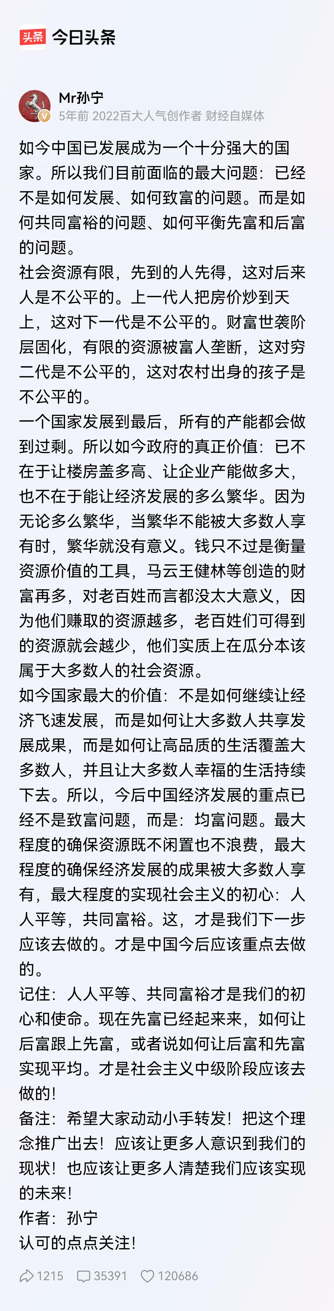 郑丽文要来,那篇2021年的爆文也该有个“续集”了 郑丽文要来了。4月7号到12号,江苏、上海、北京。她在台北开记者会,说要把“九二共识、反对‘台独’”写进党纲。一个前民进党人,如今成了坚定的统派。 有人问:这变化是不是太快了?我说:不快。这叫水到渠成。 这让我想起四年前那篇2211万人看的帖子。当时它提了三个“不公平”:房价被上一代人炒上天,年轻人接盘;社会资源先到先得,后来人吃亏;财富世袭,穷二代没机会。 帖子很火,3.5万条评论。为什么?因为说的都是实话。 但今天站在2026年回头看,我想说的是另一句话:那些尖锐的问题,这四年半,正在被一个一个地拆解。 一、房价的事,大家心里都有数了。 2021年那会儿,一线城市买房平均年龄36.6岁,六个钱包凑首付。现在呢?保障性住房、共有产权房、租购并举,一套组合拳打下来,房价没崩,但也不再疯涨。年轻人不再把“买房”当成人生唯一的KPI。这不是问题彻底消失了,而是问题被放进了该放的位置——不急,慢慢来。 这叫东方智慧:急病慢治。 二、资源分配的事,方向已经变了 帖子说“繁华不能被大多数人享有,就没有意义”。这话四年半前是警钟,今天回头看,钟声已经起了作用。2026年政府工作报告第一次明确写进“城乡居民增收计划”,基层养老金每月涨20,医保补助涨24。不多,但你看那个方向——从“先富”转向“共富”,从“效率优先”转向“兼顾公平”。 这叫东方智慧:不折腾,但也不停步。 三、代际公平的事,不再是没人管的野孩子 “上一代人留给下一代的债”——这个话题四年半前还是网络上的愤怒宣泄。现在呢?遗产税在试点,教育均衡在推进,职业教育和普通高考的围墙在拆。农村孩子的出路,不再是只有“考出去”一条独木桥。 你没听到鞭炮声,但墙在一点点拆。这就是东方智慧:治大国如烹小鲜,翻早了会烂,翻晚了会糊,火候正好才见功夫。 写在最后—— 回到郑丽文。她这次来,表面上是谈观光、农产、服务业。本质上,是台湾的老百姓也看到了——从那篇帖子发出到现在,四年半过去了。大陆这四年半,虽然在解决自己的问题,但每一步都走得稳。 和平统一这件事,不是靠喊口号,而是靠“让日子好起来”这个事实,慢慢把人心拉过来。 什么叫东方大国智慧?不说狠话,不做绝事,但每一步都算数。 问题尖锐不怕,怕的是不动。四年半前那篇帖子提出的问题,今天正在一个个被回应。郑丽文来,就是对岸看到了这个回应。 所以,那篇2021年的爆文,到今天可以写个续集了。续集的标题我想好了: “问题正在解决,我们每一步都走得稳。”