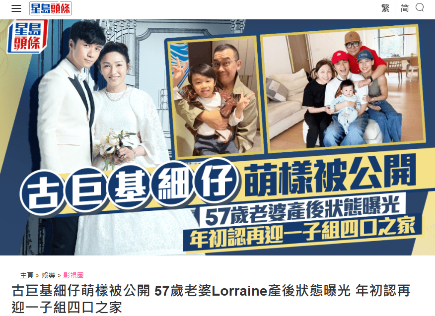 【古巨基57岁妻子产后状态】好幸福的一家~最近,雷颂德晒出与古巨基一家相聚的照片,古巨基的妻子及小儿子的样貌引起网友关注。现年53岁的古巨基与57岁的太太Lorraine,继5年前诞下大儿子Kuson后,今年元旦宣布家中再添新成员。(星岛头条)