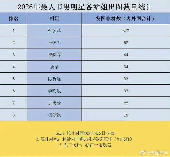愚人节站姐出图男明星数量统计愚人节站姐出图男星数量统计本次愚人节站姐团建出图统计已出炉,涵盖多位人气男艺人,95生名单也已整理完成,直观展现当日粉丝应援与出图情况。