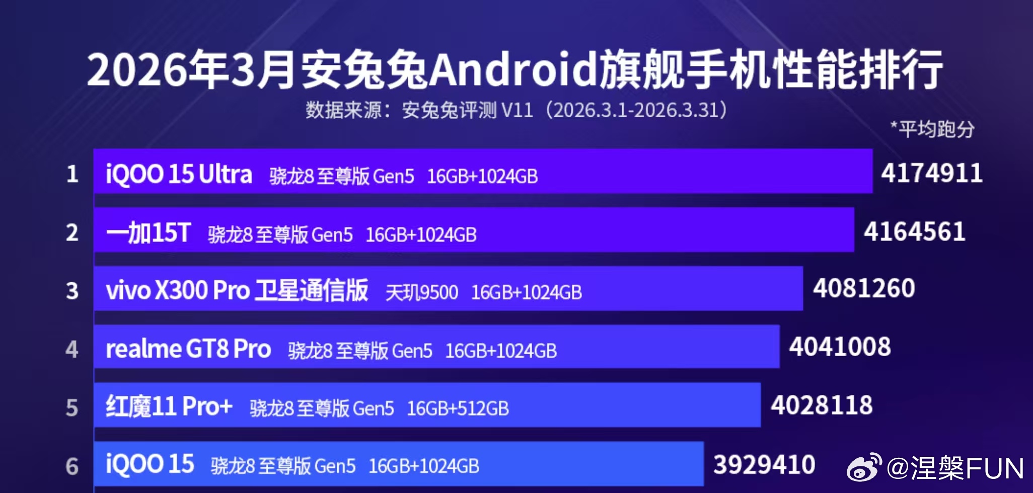 2026年3月安兔兔安卓旗舰性能榜,一加15T是唯一小屏旗舰,性能排第二,直接对标Ultra。