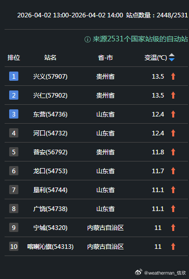 今天在冷空气过后,或放晴后,内蒙古中东部、山东北部、贵州西部等地升温明显,升幅超10℃。贵州兴义升13.5℃、兴仁升13.5℃、山东东营升12.4℃、河口升12.4℃、内蒙古宁城升11℃、喀喇沁旗升11℃,为各自省区14时升温最强站点。