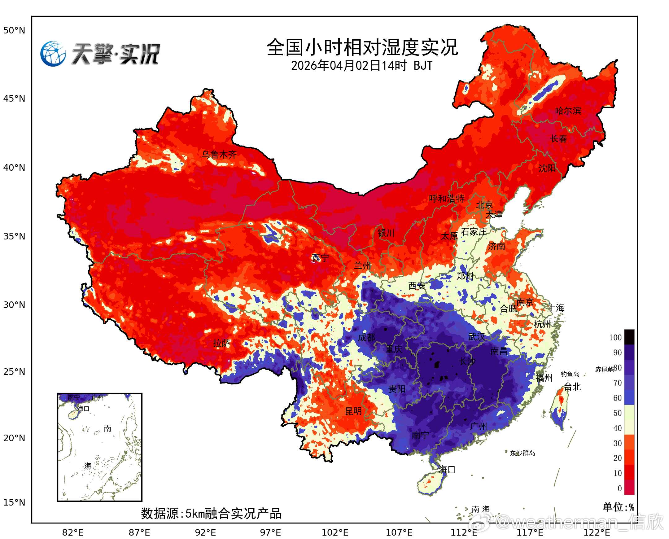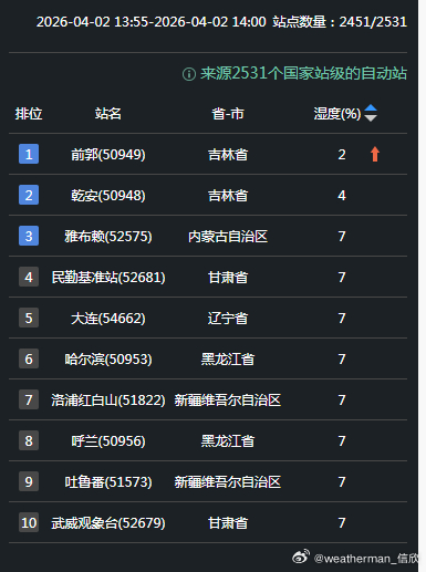 【南北干湿分明】今天又是南北干湿差异大的一天,北方部分站点,14时相对湿度找不到10%,吉林前郭只有2%,正所谓春分地皮干。哈尔滨和大连也只有7%,与新疆吐鲁番一样干燥。南方因为有降水,广西湖南江西部分站点湿度达到了100%饱和,比如湖南湘潭,醴陵、邵东、花垣、汨罗、广西富川、三江、江西瑞金、宜黄、金溪。