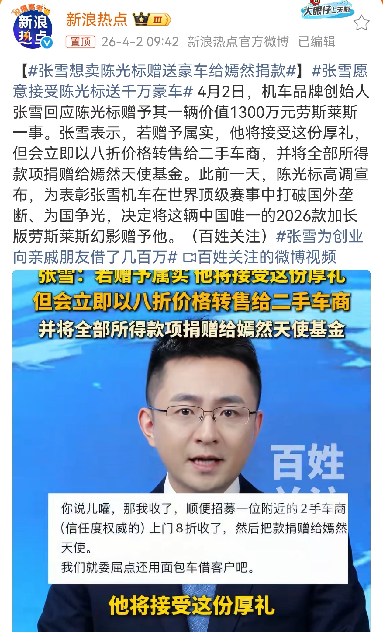 张雪机车作为2024年才成立的中国摩托车品牌,短短两年便以顶级赛事夺得双冠。随后,慈善家陈光标公开表示,将一台价值1300万的全新劳斯莱斯无偿赠予张雪,本意是助力其商务接待。张雪则想将豪车转售,再捐赠给嫣然天使基金,用于帮助唇腭裂儿童救治。张雪想卖陈光标赠送豪车给嫣然捐款张雪机车比赛中换轮胎一幕