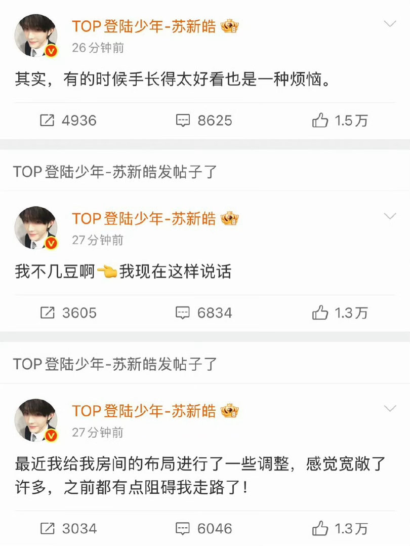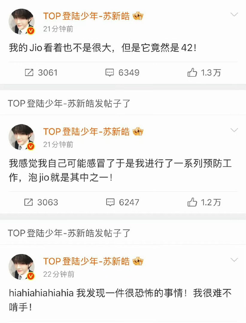 苏新皓泡脚预防感冒苏新皓在超话里唠嗑了 苏新皓你小子是把超话当朋友圈了吧!中午休息跑来唠嗑,从刘海该剪了的小细节,到泡脚防感冒的养生日常,再到42码的小爆料,甚至把要见面的开心都分享出来,这波沉浸式唠嗑直接把粉丝的距离拉满
