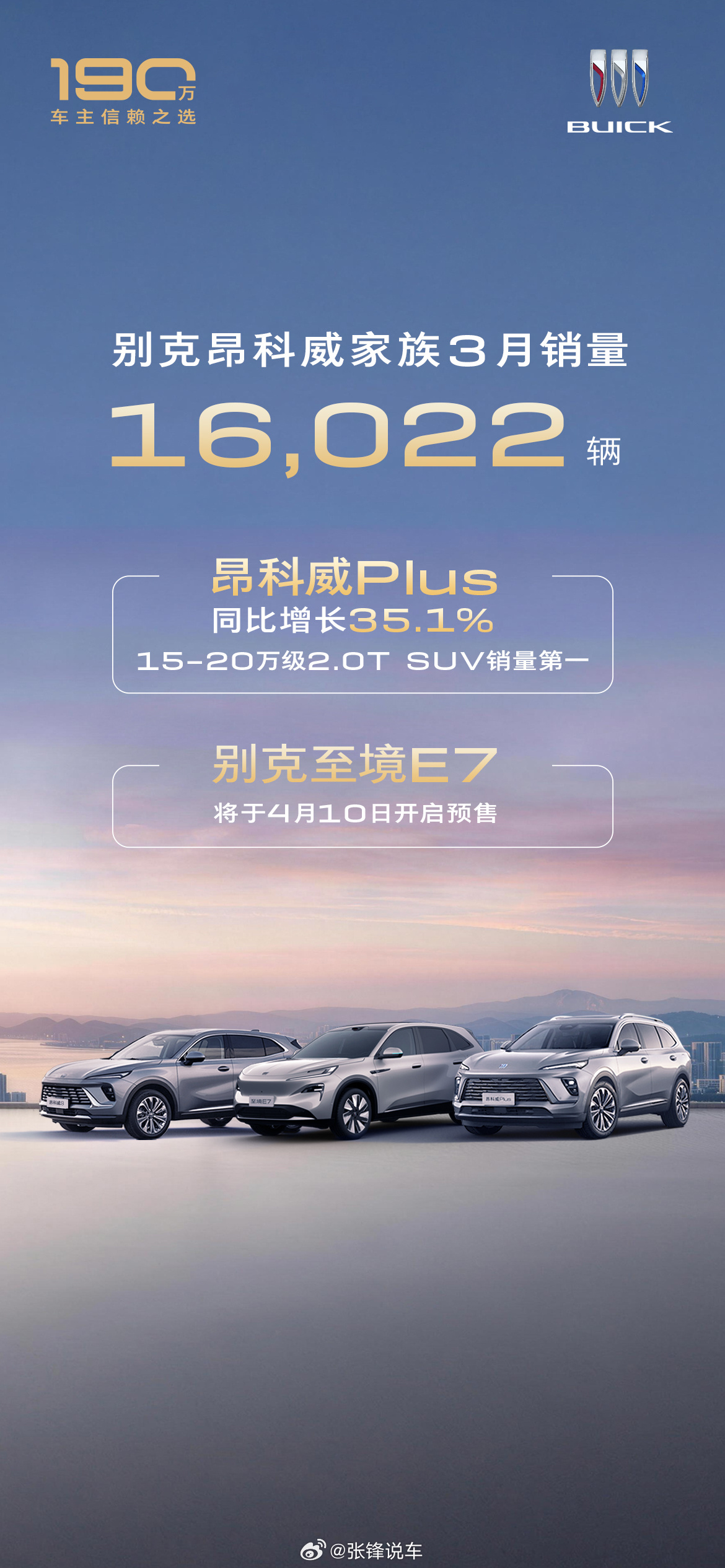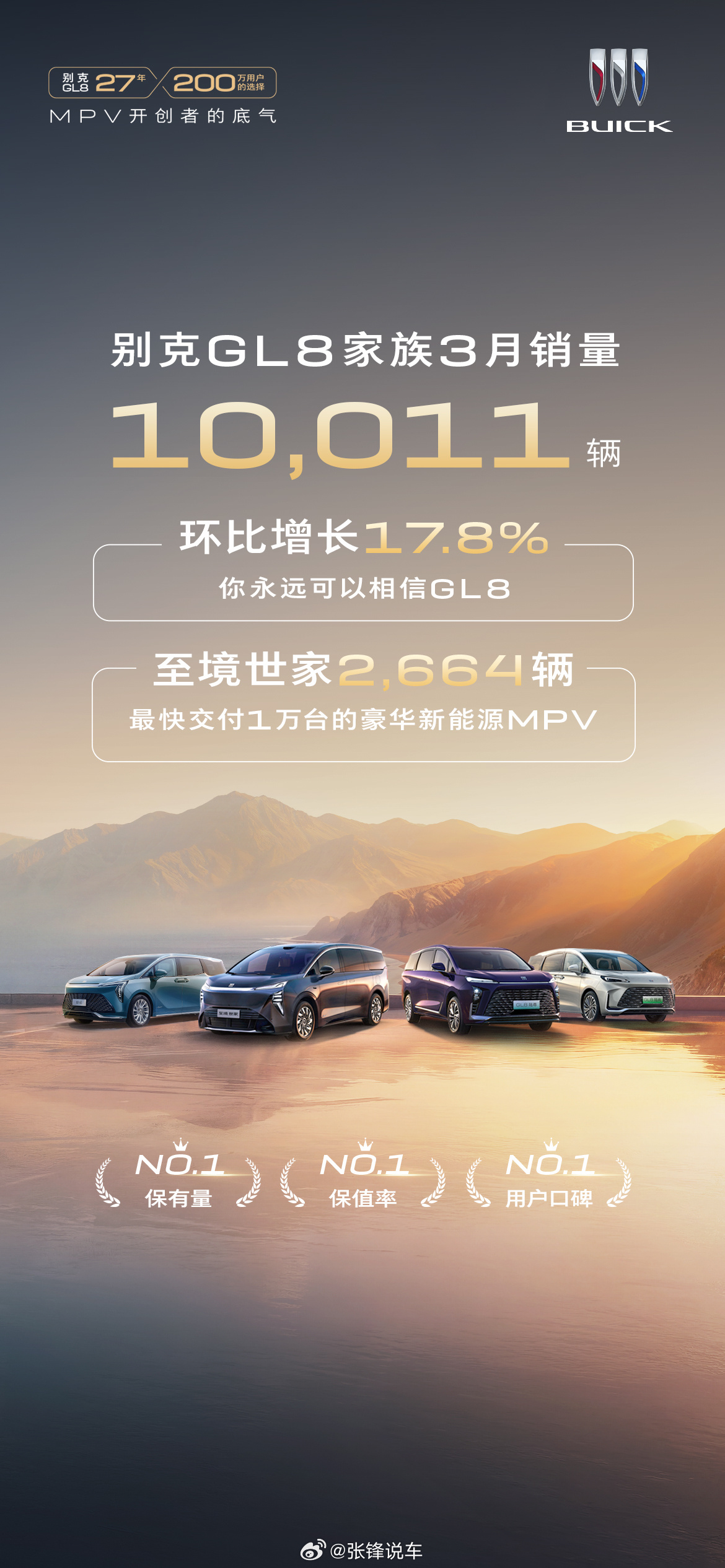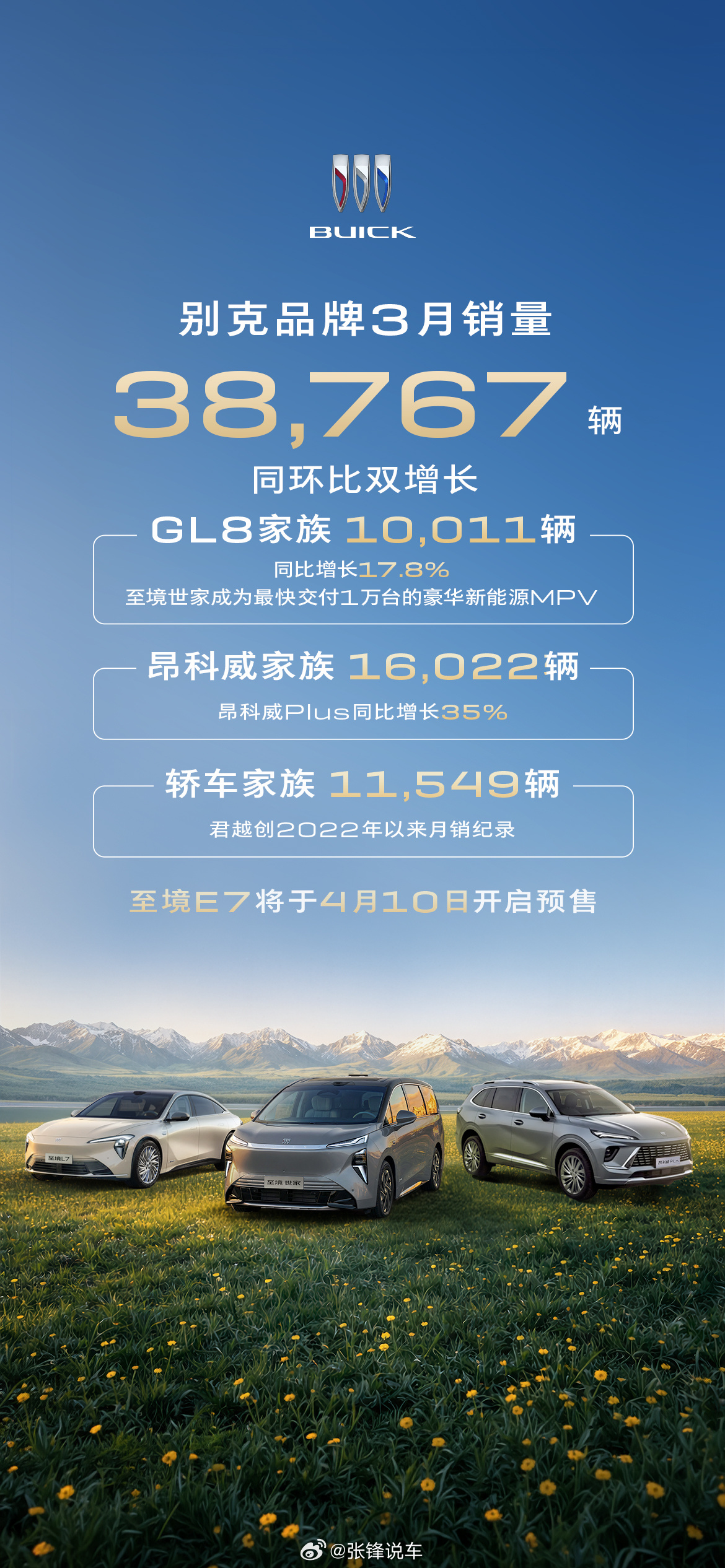 别克品牌3月销量38,767辆,同环比双增长🚗GL8家族10,011辆,同比增长17.8%。至境世家成为最快交付1万台的豪华新能源MPV🚗昂科威家族 16,022辆,昂科威Plus同比增长35%。至境E7将于4月10日开启预售🚗轿车家族11,549辆,君越创2022年以来月销纪录