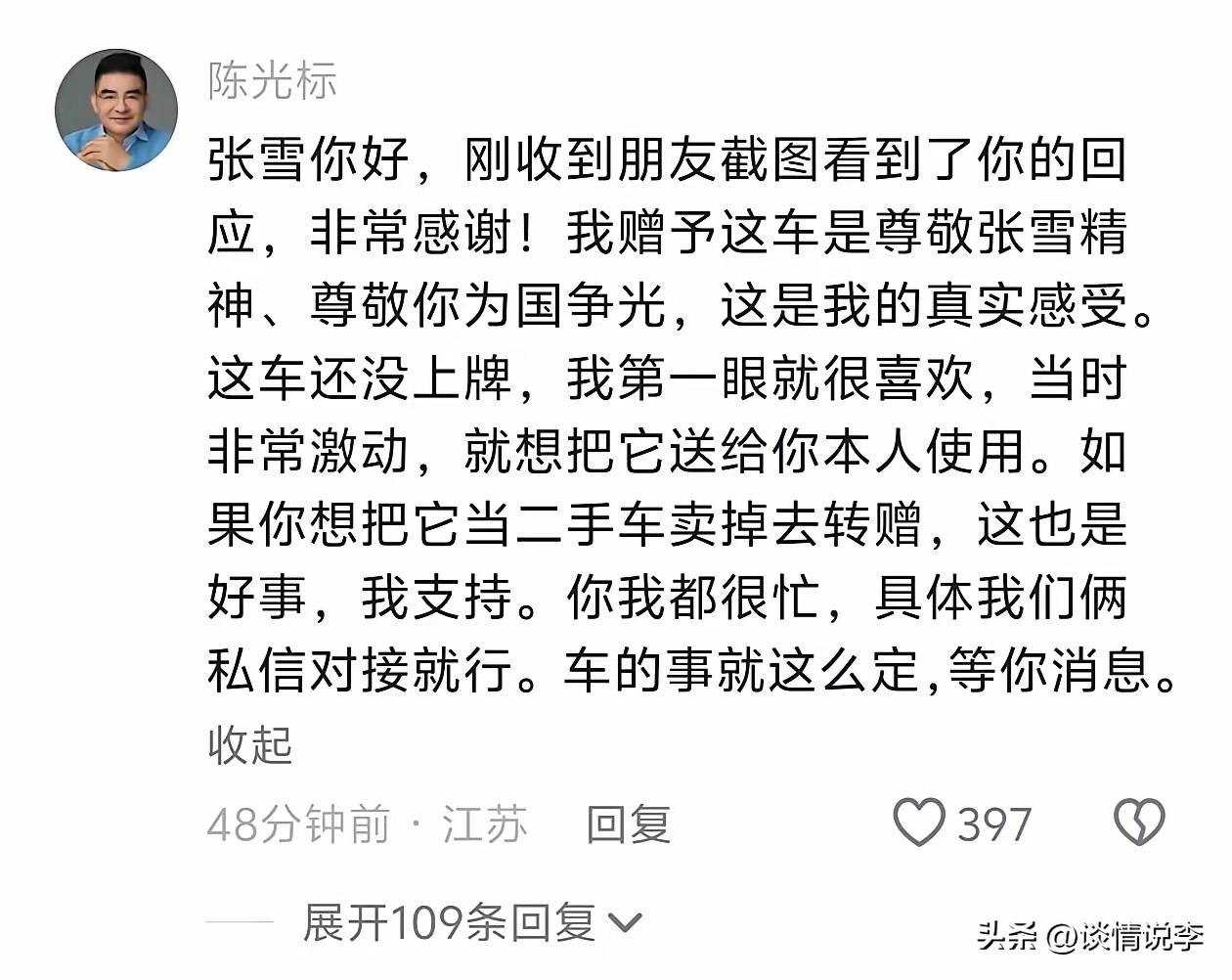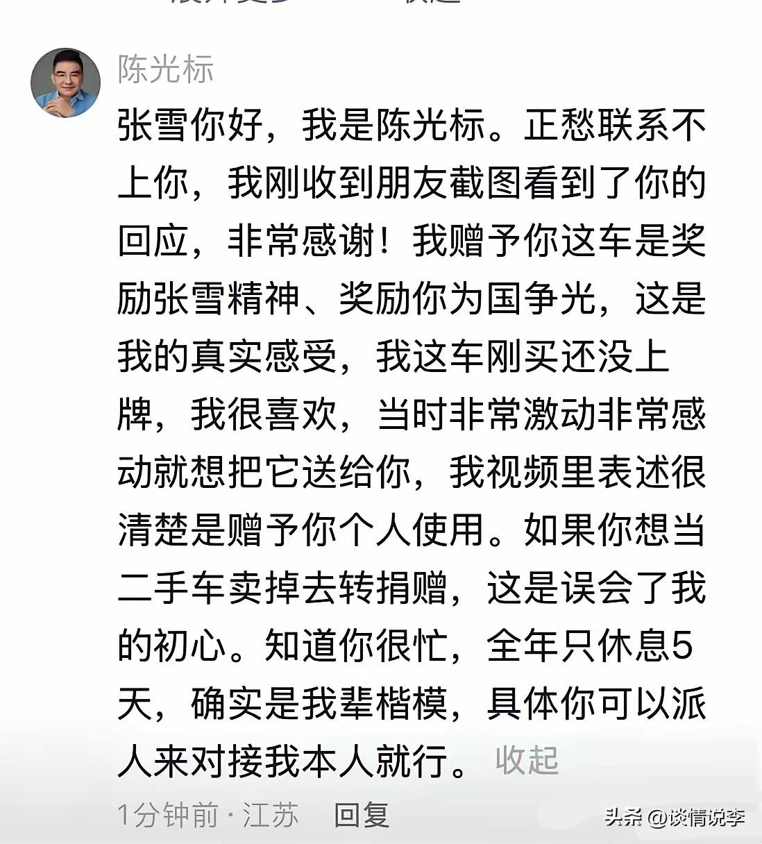 张雪究竟能不能收到陈光标送的劳斯莱斯还是一个未知数。张雪机车夺冠后大放异彩,陈光标喊话要送张雪劳斯莱斯幻影2026,国内仅此一台。 一千三百多万的车,陈光标说送就送,真的大气,但是他说了,让张雪作为接待用车。 张雪回复说,车子他要了,但是会以八折的价格专卖给二手车商,要信誉度好的,然后把卖车的钱捐给嫣然基金。他还是继续用面包车接客户。 看到张雪的回复,陈光标赶紧回应说,这车确实是送给张雪,而且他在视频中说得很清楚是赠与张雪个人使用。如果张雪想当二手车卖掉去转赠,就是误会了他标哥的初心。最后,他说,“具体你可以派人来对接我本人就行。” 然后呢,陈光标删除了第一条信息,重新回复说:如果你想把它当二手车卖掉去转赠,这也是好事,我支持。具体我们俩私下对接就行。 张雪现在身家多少亿了?但他还在用一台两千多块的手机,已经旧得不成样子了,但是他说只要能用就行。他不是喜欢大牌和奢侈品的人,对他来说,钱只是一个数字。造出好机车,才是他的人生梦想。 那么问题来了,陈光标这车到底是送不送啊?看得人真着急!
