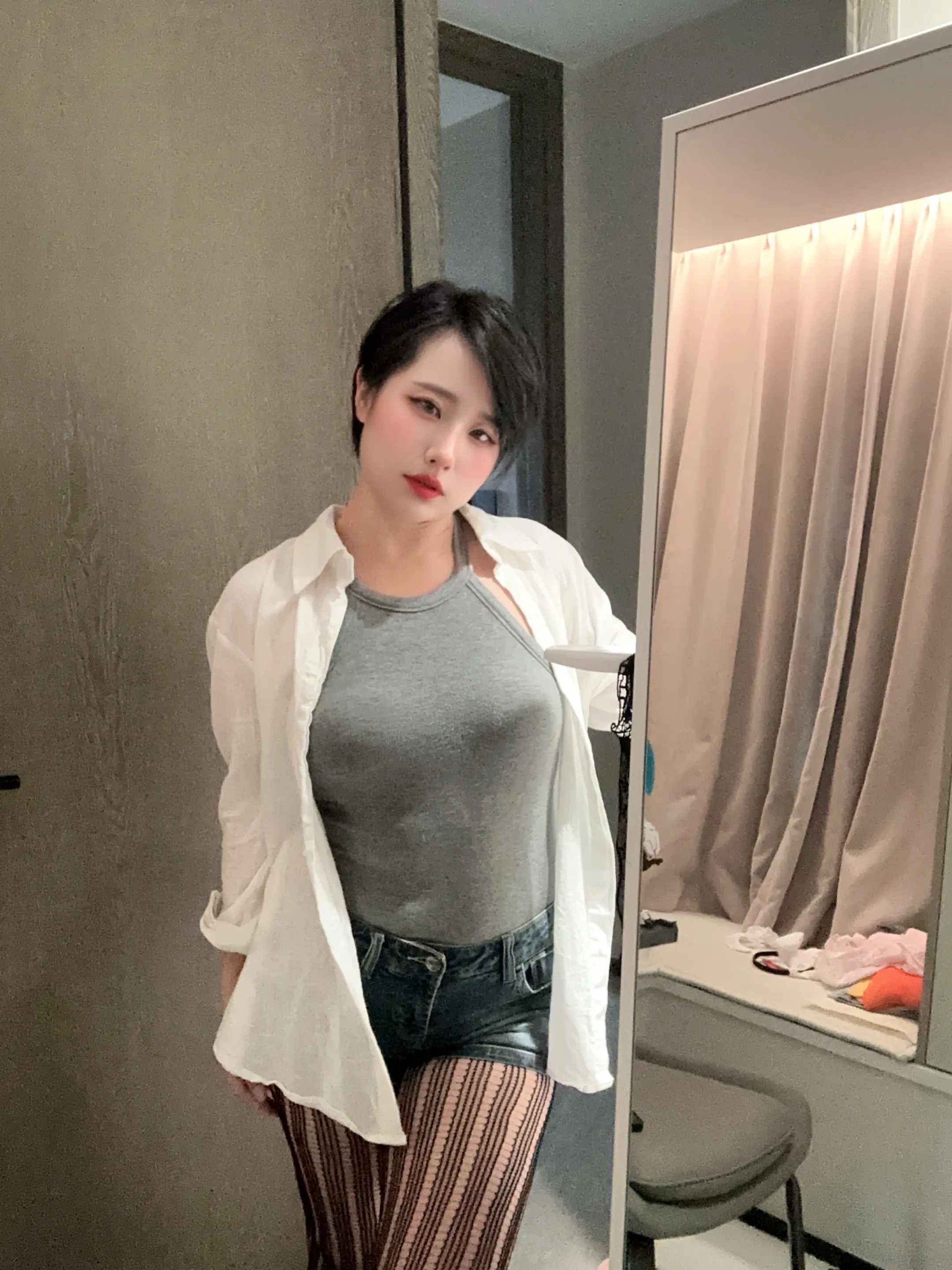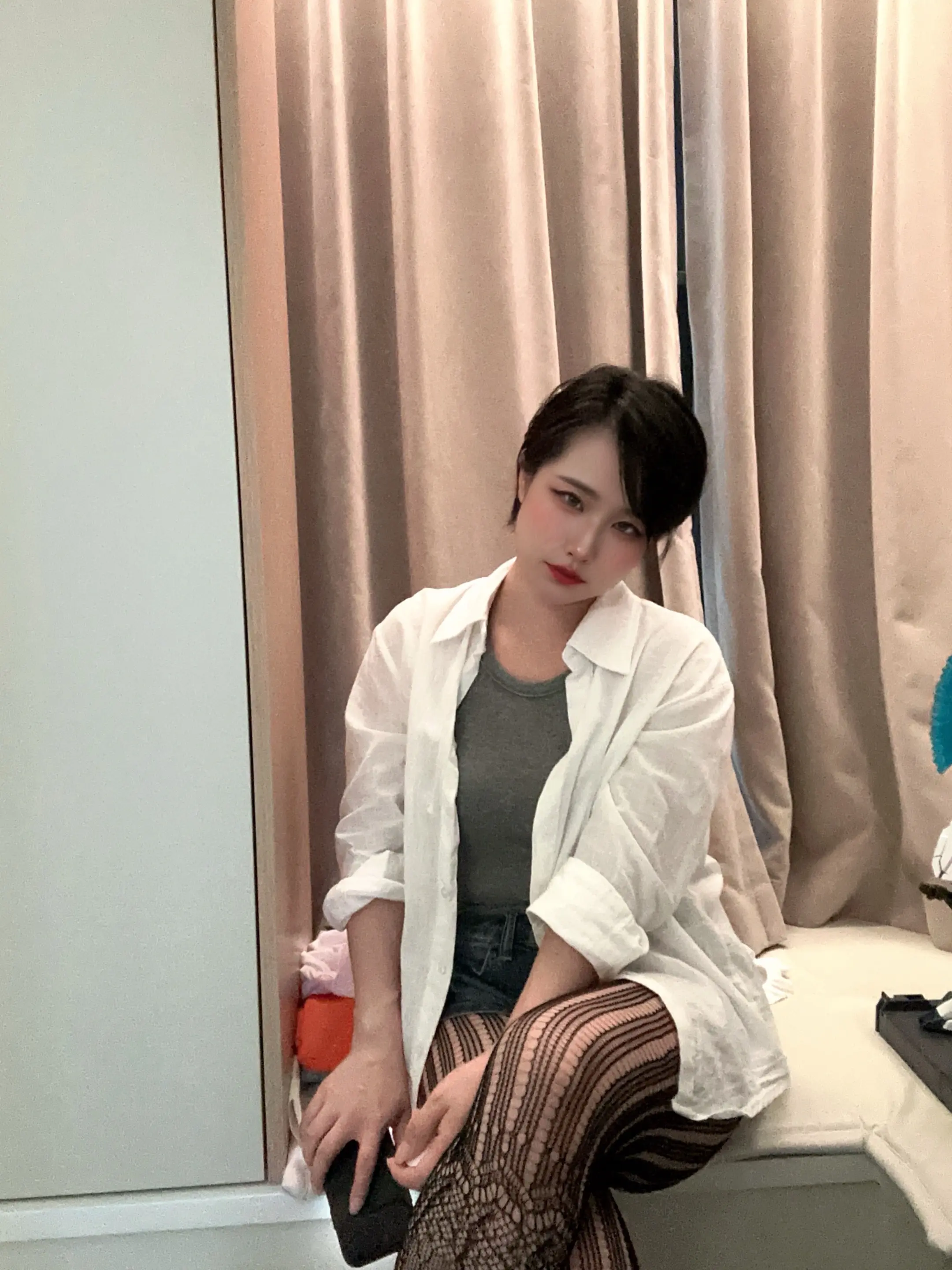 素裙凝雪色,黑丝映清光。缓步商场里,风轻带暗香。