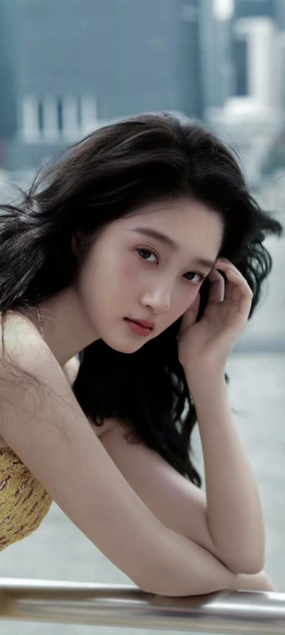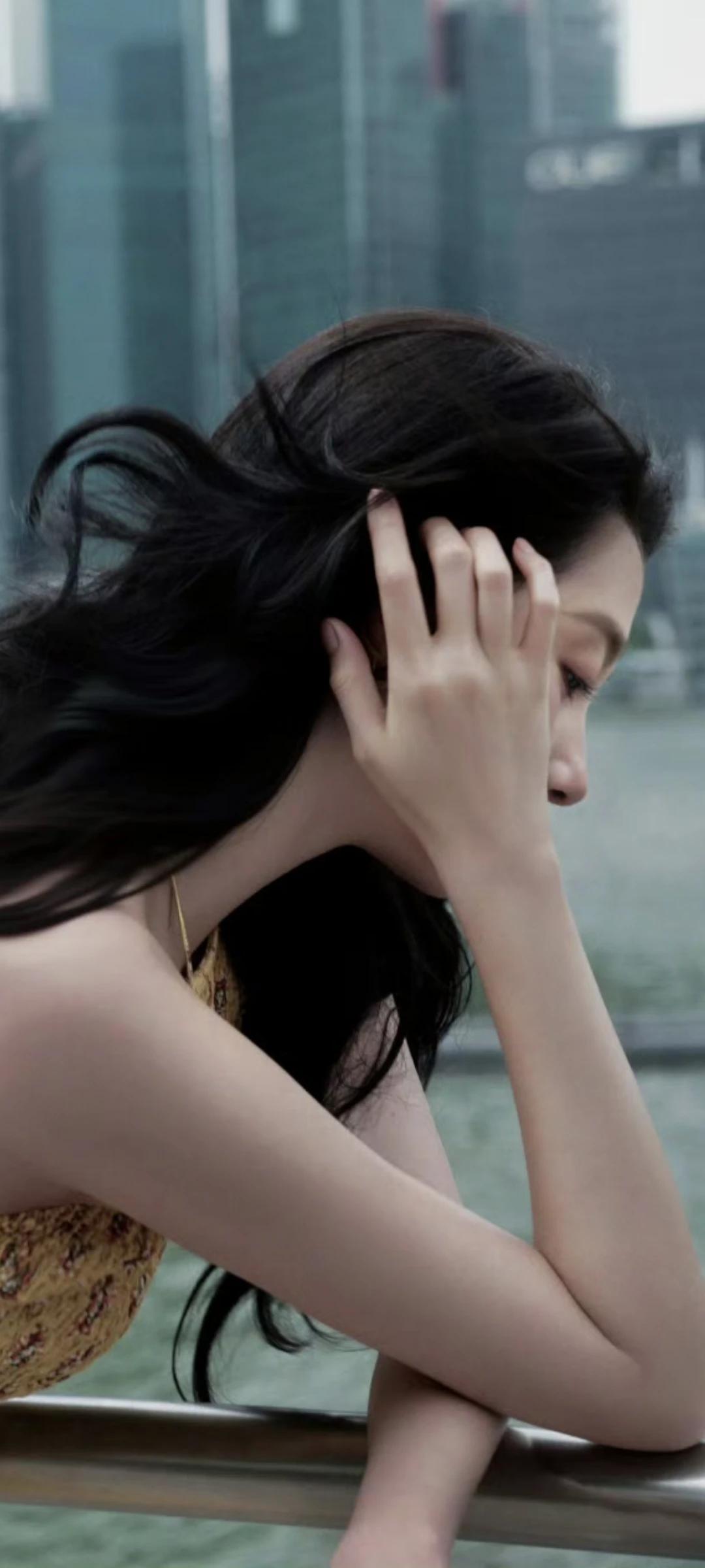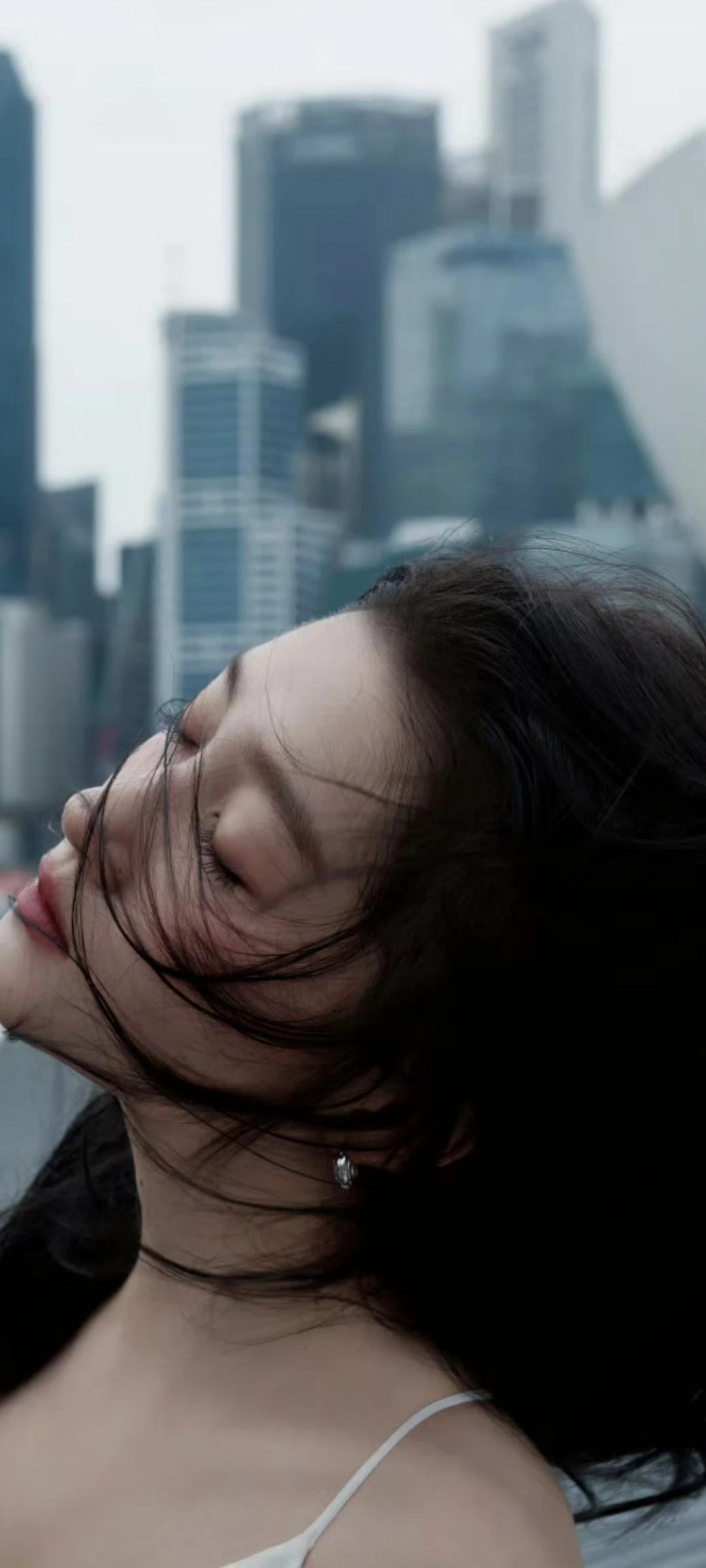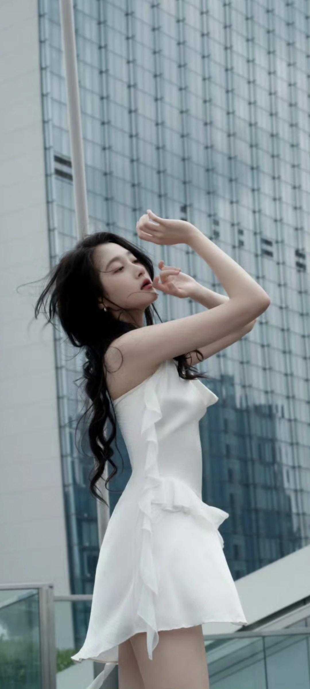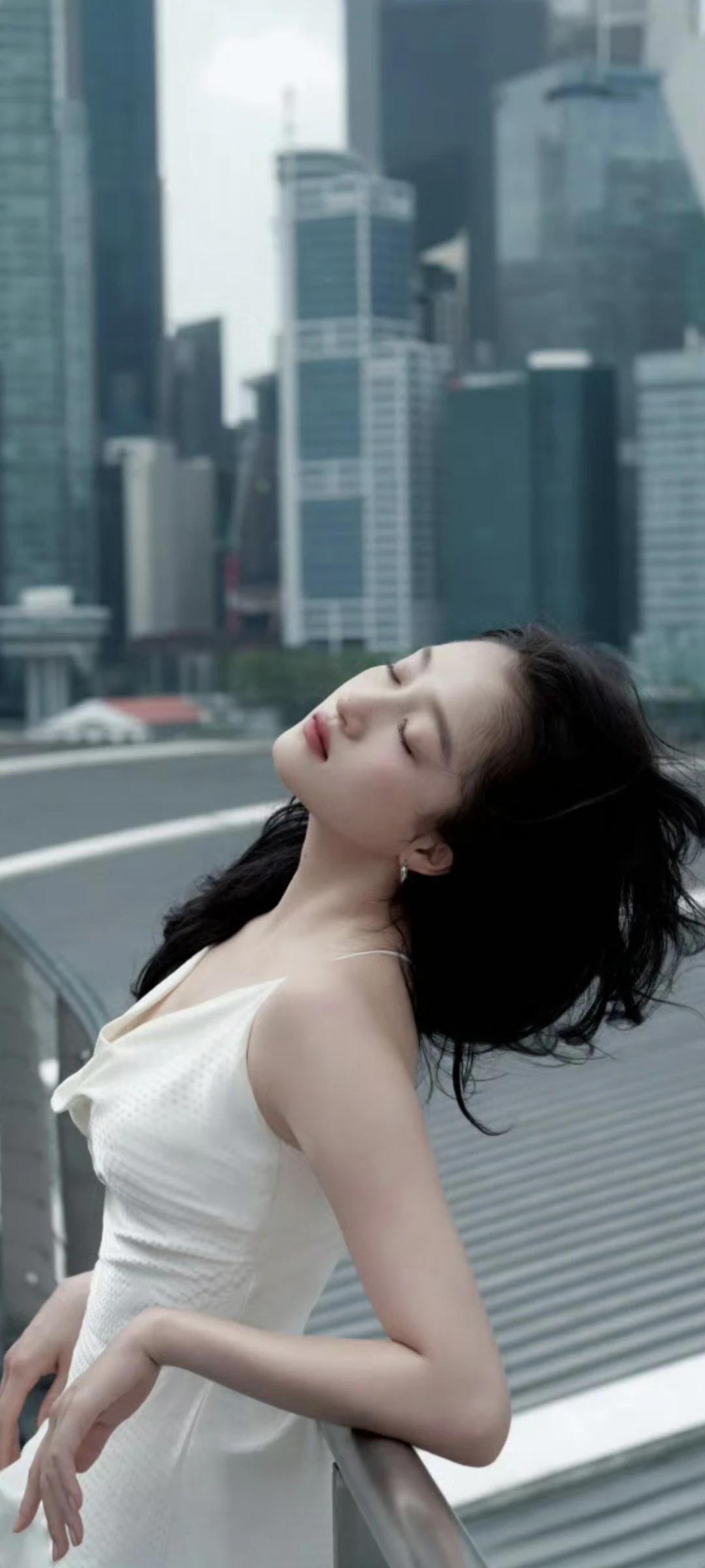 关晓彤壁纸~白裙配黑长直,在城市背景下超级美!