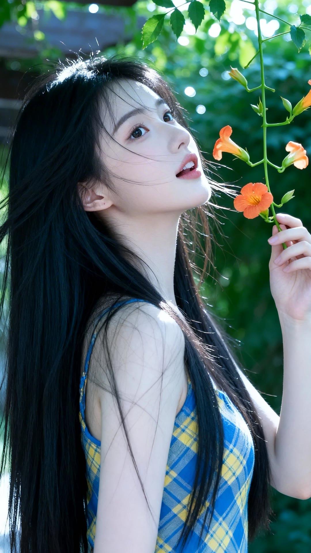阳光下的少女与盛开的橙花,自然与青春的完美融合。🌸💐🌞