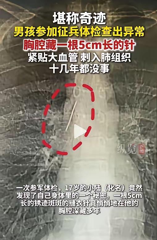 真的太险了!17岁少年去参军体检,居然查出体内藏着一根缝衣针,差点要了命。 17岁的小陆一直特别向往军营,高高兴兴去报名参军,本以为一切顺利,结果胸片一出来,所有人都吓傻了。 他胸腔里赫然有一根金属针,深深扎在肺里,针尖还紧紧贴着大血管,随便一动就可能大出血,随时有生命危险。 更让人后怕的是,这根针在他身体里十几年了,他居然一点感觉都没有,不疼、不发炎、也没异常,医生都说是医学奇迹。 父母回想起来,小时候孩子确实总莫名哭闹,当时没查出问题,没想到是一根针留在了体内。 说白了,要不是这次参军体检,这颗定时炸弹不知道什么时候就爆了。 很多网友都说,是孩子想当兵的初心,救了自己一命。 看似平安无事的日子,背后藏着这么大的隐患,真的看得人头皮发麻。 家长带孩子真的一刻都不能马虎,小小的一件东西,差点酿成大祸。 这孩子也是真的福大命大,有惊无险。 你们小时候有没有过莫名受伤、至今想起来都后怕的经历?