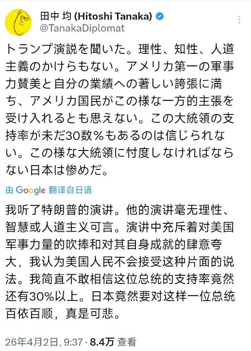 日本著名外交官、前外务副大臣田中均今天(4月2日)发文写道:“我听了特朗普的演讲。他的演讲毫无理性,智慧或人道主义可言。演讲中充斥着对美国军事力量的吹捧和对其自身成就的肆意夸大,我认为美国人民不会接受这种片面的说法。我简直不敢相信这位总统的支持率竟然还有30%以上。日本竟然要对这样一位总统百依百顺,真是可悲。” 特朗普的演讲风格从来不是传统政客的严谨克制,而是直白的情绪煽动与自我标榜。 他反复强调美国军事优势,甚至抛出万亿美元军费预算的主张,称连10美分都不会削减,将美军实力包装成美国霸权的唯一底气。 在中东议题上,他断言伊朗军事能力已被严重削弱,声称自己平息了多场国际冲突,却拿不出具体证据支撑。 在经济与内政领域,他夸大投资规模、美化治理成果,可现实是美国民众对燃料价格飙升、伊朗冲突处理方式的不满持续上升,超六成受访者不认可其应对国际冲突的方式,超七成认为他未关注国家核心问题。 这种脱离现实的自我吹嘘,在理性视角下毫无说服力,也难怪田中均会直言其演讲缺乏基本的理性与人道主义。 特朗普支持率维持在30%以上,并非美国民众普遍认可其执政表现,而是美国社会深度撕裂下的特殊结果。 美国选民结构早已分化,保守派基本盘对其移民政策、反全球化立场高度认同,成为支持率的核心支柱。 同时,身份政治的极化让不同群体的诉求完全错位,部分选民将特朗普视为对抗所谓“精英阶层”的符号,即便不满其施政,也不愿转向其他候选人。 还有不少选民对美国现状感到无奈,认为特朗普的“激进”至少代表改变的可能,这种复杂的投票心理,让支持率脱离了实际执政效果的约束,成为美国政治分裂的直观体现。 日本对特朗普政府的“百依百顺”,本质是日美同盟不平等关系下的被动妥协。 二战后形成的日美安保体系,让日本在安全领域高度依赖美国,2026年度日本防卫预算首次突破9万亿日元,创历史新高,背后是对美国军事保护的依附需求。 日本首相高市早苗访美时,刻意展现逢迎姿态,称特朗普能为世界带来和平与繁荣,却换来冷遇,美方甚至将日本写入全球威胁评估报告,当众以珍珠港事件调侃,尽显同盟关系的不对等。 日本在台海、中东等议题上,被迫配合美国的战略诉求,即便自身面临宪法框架的制约,也难以拒绝美方要求,这种被动的外交选择,让日本在同盟中逐渐失去主动权,沦为美国全球战略的“付费盟友”。 田中均的批评,不仅是对特朗普个人的否定,更是对日本外交困境的清醒认知。 作为长期参与东北亚安全与对朝外交的外交官,他深知日美同盟的现实束缚,也清楚这种无底线迁就带来的风险。 日本在安全依赖与主权自主之间的矛盾,美国霸权扩张与国内治理失效的失衡,共同构成了当下美日关系的尴尬局面。 这种局面既不符合日本的长远利益,也不利于地区的稳定与发展,这正是田中均感到“可悲”的核心原因。 在全球政治格局深刻调整的当下,特朗普式的民粹主义演讲与日美同盟的失衡,正成为影响地区与全球秩序的重要变量。 田中均的发声,既是对美国政治乱象的批判,也是对日本外交方向的提醒。 当一国领导人沉迷于自我吹嘘,当一国在同盟关系中失去自主,最终付出代价的,必然是两国普通民众的利益与地区的和平稳定。