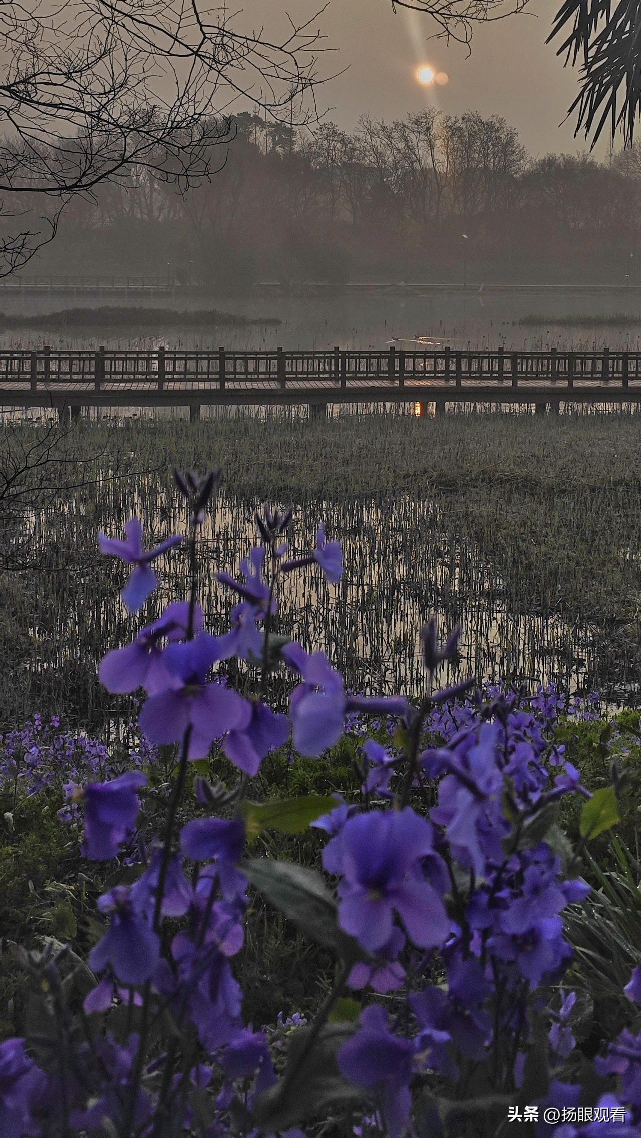 我漫步在清晨的扬州宋夹城体育公园里,只见飘着薄雾河畔边的二月兰显得特别艳丽,让人