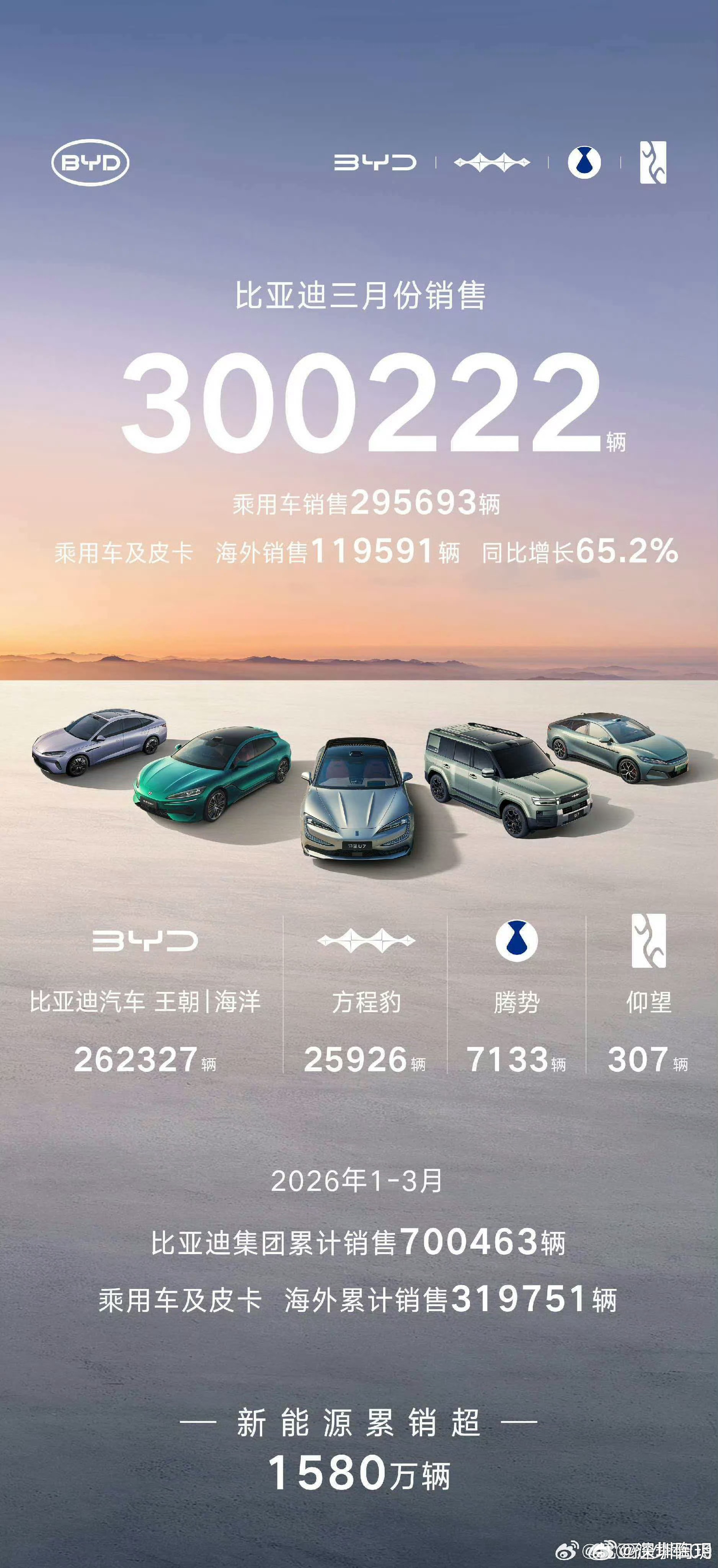 树立新能源汽车新标杆,我们必须要看比亚迪。4月1日,各车企通报销量,翘首以盼,我先是看到大V孙少军发的数据300222辆。后来去翻云飞总发的数据300222辆,终于坐实这个权威的数据。比亚迪3月单月中国车企销冠、一季度新能源销冠,双冠王。加油啊!迪子。