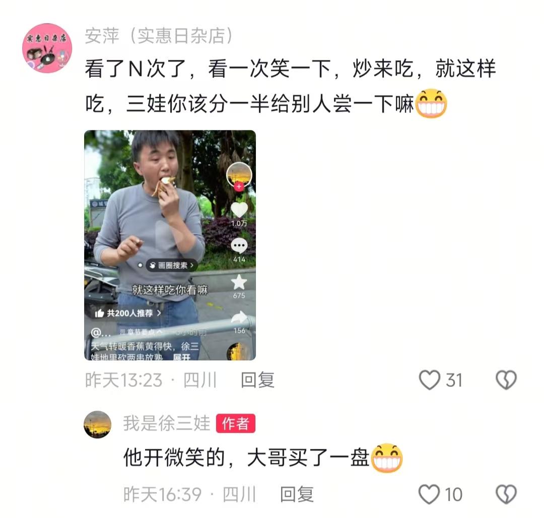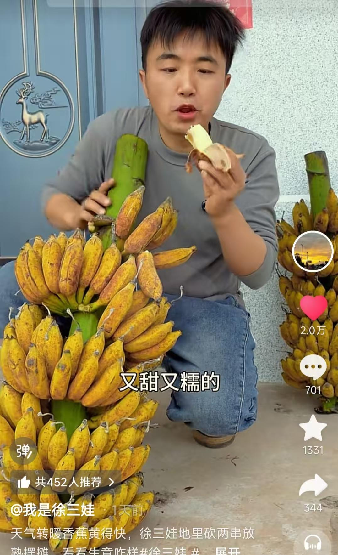现在全网最羡慕的男人就是徐三娃了吧! 不是因为赚了大钱,也不是因为成了大网红 而是因为自家种的香蕉砍下来放3天就甜糯流蜜,摆摊半天就卖光,还收获了一堆预定的回头客!真服了 谁懂啊!今天摸鱼刷到徐三娃的香蕉视频,本来只想划走,结果硬生生看完全程,还对着评论区笑到跺脚!说真的,比起那些装腔作势的剧本,这种沾着泥土气的日常,才真的戳人啊。 说实话,看他扛着竹竿往香蕉林冲的时候,我都替他捏把汗,本来以为要费半天劲,结果人家麻溜的,绑树、拉弯、挥刀砍串,一套动作行云流水,不一会儿就砍了两大串,给力! 本来我还纳闷,青不拉几的香蕉能吃?结果人家放屋里三天,全黄透了,当场啃了一口说又甜又糯,我隔着屏幕都咽口水了,不是吧?自己种的香蕉真的这么巴适? 然后他就扛着香蕉去菜市场摆摊了,说真的,最戳我的就是他抹零那一下,11块8直接收11块,换别的商家说不定还凑整收12呢!没到天黑就卖得七七八八,剩下烂的发霉的,人家也不坑人,说拿回去自己吃或者喂鸡,这种佛系摆摊的感觉,真的太舒服了! 还有人没买就先加了微信,说下次卖提前说,这不就是最大的认可吗?太棒了!之前听别人说,做事最难得的就是不欺心,种庄稼卖东西都一样,不坑人不耍滑,赚该赚的钱,这不就是别人说的种善因得善果嘛。 说真的,我之前也跟风在网上买过生香蕉,本来想放着慢慢吃,结果要么全放烂了,要么熟得不均匀,一半硬得硌牙一半烂得流水,给我整崩溃了,郁闷了好几天。 现在看评论区老蕉农的建议才知道,原来要按熟度分开放,不然熟得早的很容易烂,我晕,早知道这个技巧,我之前也不至于浪费那么多香蕉啊! 总之,我想说的是,现在看多了花里胡哨的剧本,反而对这种实在的日常毫无抵抗力,可能是吧,大家就喜欢这种不装的感觉。是吧?