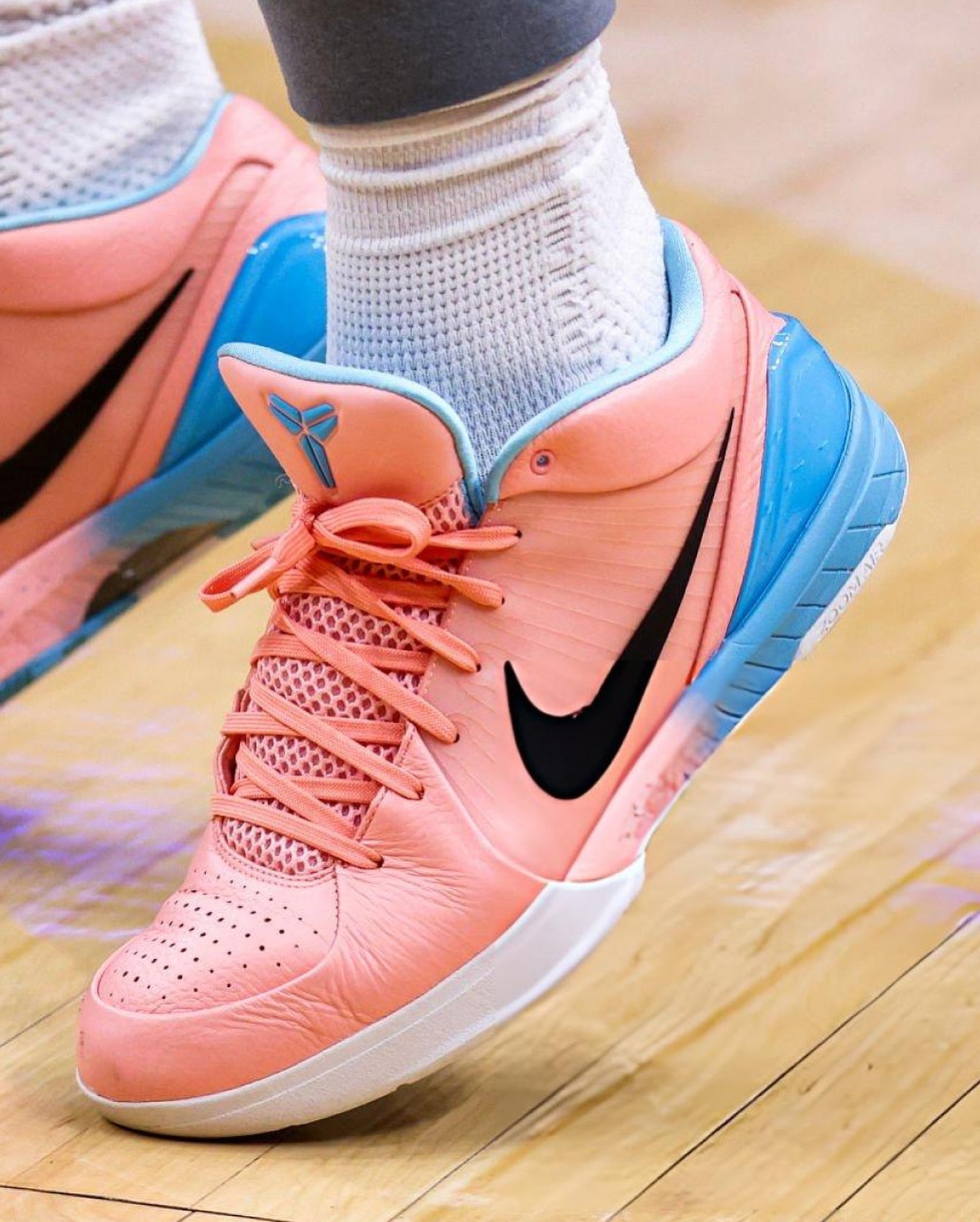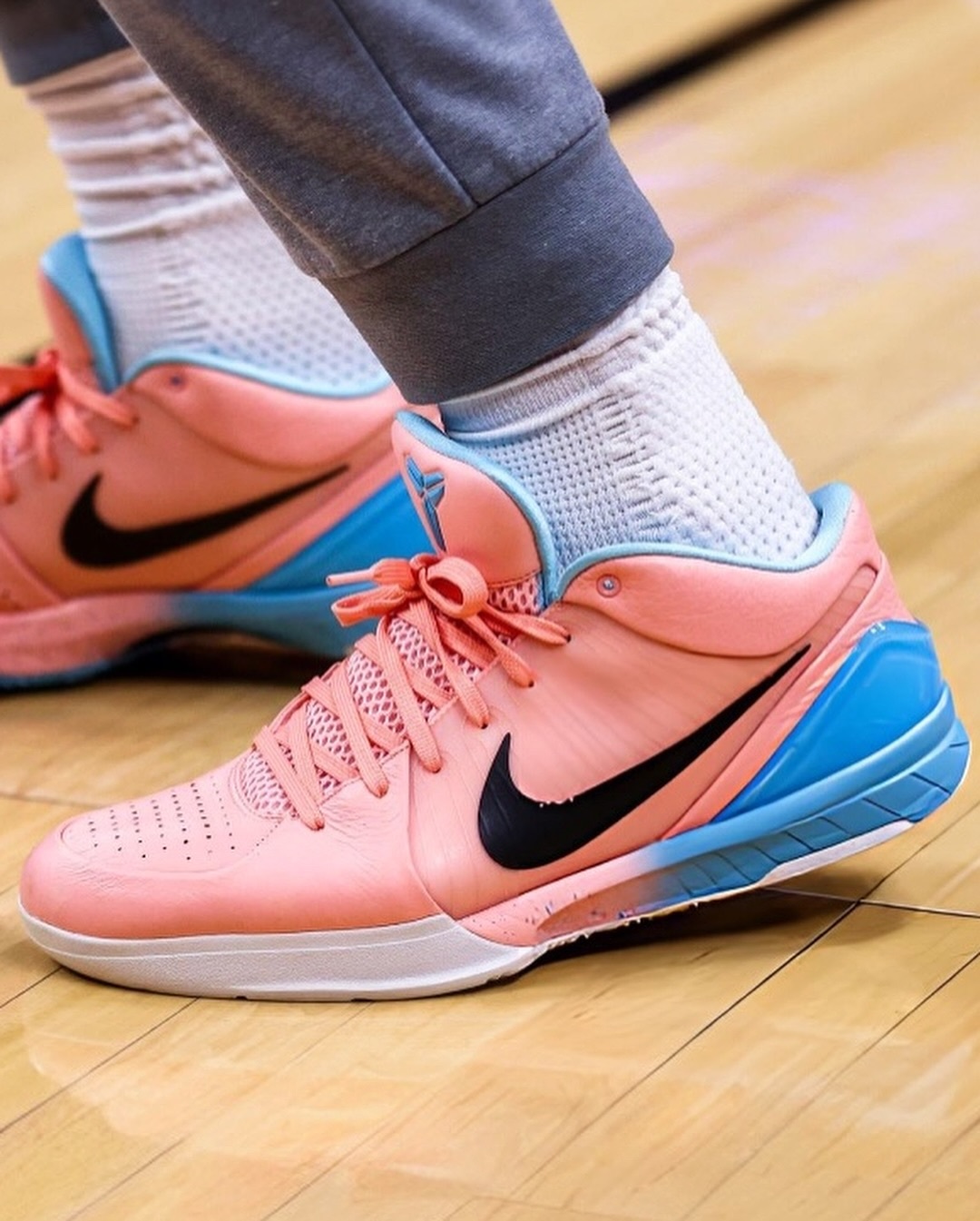 德罗赞在赛场上脚了一双个人专属的 Nike Kobe 4 Protro “Drew Aid” PE。整双鞋以亮眼的粉色为主调,场上存在感极强。