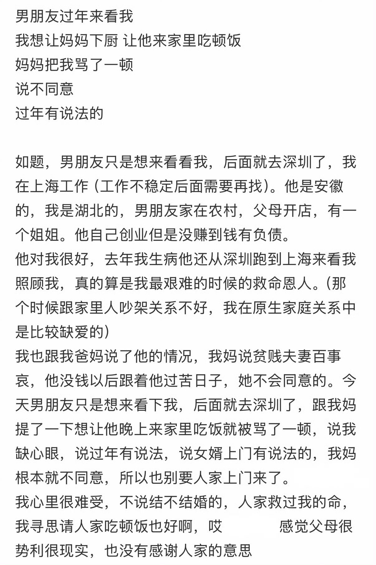 男朋友过年来看我,我想让妈妈下厨,让他来家里吃顿饭,妈妈把我骂了一顿